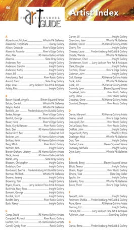A Albrechtsen, Michael ........................ Whistle Pik Galleries Alexander, Todd Slate .................................GAray Gallery Allison, Deborah ...............................River’s Edge Gallery Alsworth, Paulette ............................River’s Edge Gallery Alvis, Alex ...................................RS Hanna Gallery Artists Alkemie ................................................ Slate Gray Gallery Andersen, Roy ...........................................Insight Gallery Anderson, Carolyn .....................................Insight Gallery Anderson, Kathy ........................................Insight Gallery Anton, Bill ...................................................Insight Gallery Armulowicz, Ted ................................ River Rustic Gallery Arnold, Carol ....................................... Slate Gray Gallery Arpa, Jose ..................Larry Jackson Fine Art & Antiques Ashby, Rett .................................................Insight Gallery B Bacon Kidwell, Angela ..................Eleven Squared Venue Balciar, Gerald .................................. Whistle Pik Galleries Balyon, André .................................. Whistle Pik Galleries Banfield, Jan ............ Fredericksburg Art Guild & Gallery Barker, Margie ...................................River’s Edge Gallery Barnhill, George .........................RS Hanna Gallery Artists Bauer, Hans .......................................River’s Edge Gallery Beals, Guy & Barbara ......................... River Rustic Gallery Beck, Dan ...................................RS Hanna Gallery Artists Beckendorf, Ben ........................................ Cabernet Grill Beckner, Joy ...............................RS Hanna Gallery Artists Beilfuss, Kevin ............................ RS Hanna Gallery Artists Berg, Mitch ........................................ River Rustic Gallery Bertram, Bob .............................................Insight Gallery Bittner-Graham, Lindsey ...........RS Hanna Gallery Artists Black, James ..............................RS Hanna Gallery Artists Blanks, Amy ......................................... Slate Gray Gallery Blossom, Christopher ................................Insight Gallery Bodelson, Dan ...........................................Insight Gallery Bondurant, Bonnie ... Fredericksburg Art Guild & Gallery Borman, Phil Bob ............................. Whistle Pik Galleries Browne, Jeremy .........................................Insight Gallery Browning, Tom ...........................................Insight Gallery Bryers, Duane, ...........Larry Jackson Fine Art & Antiques Buchholz, Mary Ross ..................................Insight Gallery Bumann, George .......................................Insight Gallery Burdick, Scott .............................................Insight Gallery Burditt, Gary ...................................... River Rustic Gallery Bush, Nancy ...............................................Insight Gallery C Camp, David ..............................RS Hanna Gallery Artists Campbell, Richard ............................. River Rustic Gallery Carlton, Kim ...............................RS Hanna Gallery Artists Carroll, Cyndy River .................................... Rustic Gallery