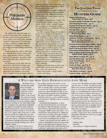 need, and they go out of their way, with typical Hill Country hospitality, to make sure you are well served. We hope visitors to Kimble County will enjoy this publication. We’ve attempted to give you some hunting information, info about local services, and a peek at our local history. We hope you like this new format. The Junction Eagle’s graphics lady extraordinaire, Ashley Lundy, worked long and hard to bring you this special edition. We think she did an excellent job for our advertisers and for you. We offer a special thanks to Frederica Wyatt. She is a living encyclopedia of Kimble County history and gives generously of her time, talent, and knowledge. Her weekly contributions in The Junction Eagle in her column “Meanderings” and our semi-annual visitor guides are invaluable. She doesn’t work at the newspaper, but she might as well, so great is her contribution. Stop by the Kimble County Historical Museum and tell her hello. We are always grateful to the Texas Parks and Wildlife Department for the enormous cache of information provided. In this Guide, we are pleased to publish the work of wildlife biologist Macy Ledbetter, Thank you for choosing to visit us. Be careful; have a great time while you’re here.....and come back soon! Jimmy and Debbie Cooper Kistler owners and editors