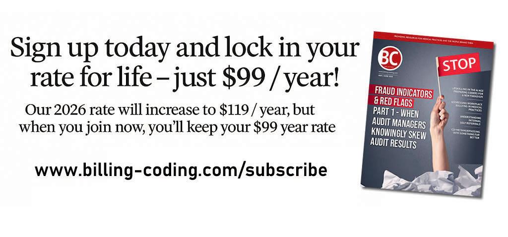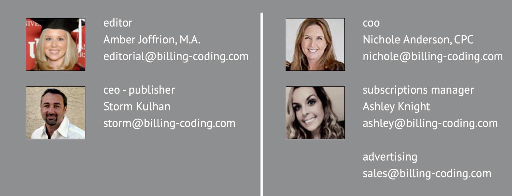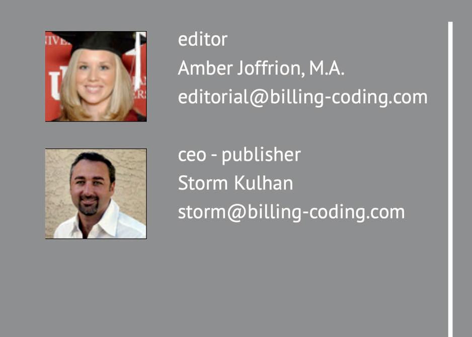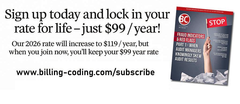 Change of address: Email subscriptions@billing-coding.com or call 864 228 7310