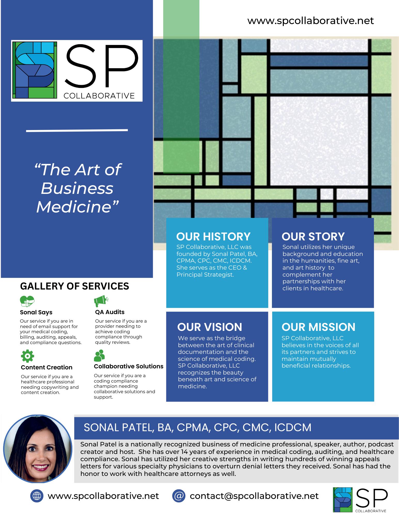 Sonal Patel, BA, CPMA, CPC, CMC, ICDCM, is CEO and Principal Strategist of SP Collaborative, LLC. Sonal has over 13 years of experience understanding the art of business medicine as a nationally recognized thoughtleader, speaker, author, creator, and consultant to elevate coding compliance education for the business of medicine. www.spcollaborative.net