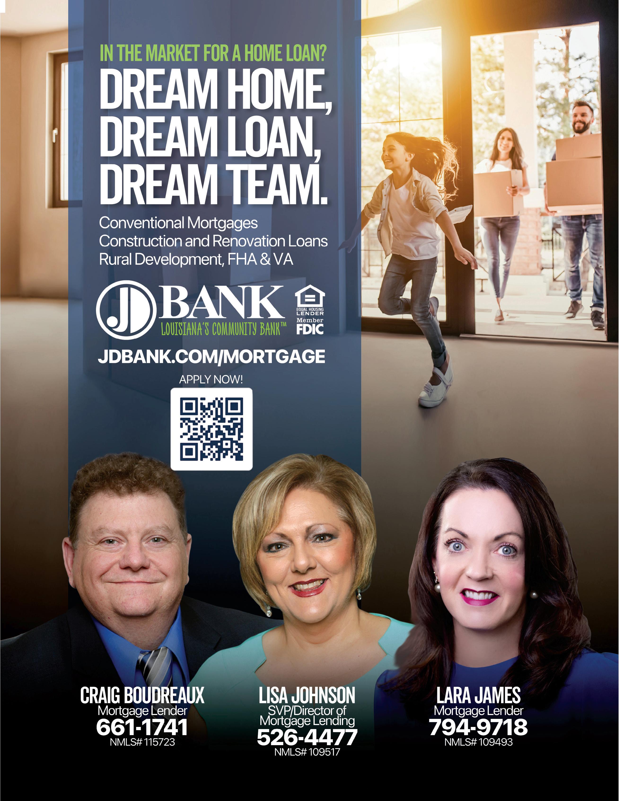 337.419.0604 337.936.0976 NMLS# 1830244 337.936.0276 Katilyn LaBove NMLS# 2006581 318.730.0824 129 W. College St. | Lake Charles, LA 70605 5400 Nelson Rd. Ste 200 | Lake LA 70605 337.517.7151 Specialists Specialists YOUR HOME LOAN YOUR HOME LOAN NOLA Lending Group has the experience and expertise to guide you through the home loan process for purchases and refinances. Now serving you with TWO locations! This does not constitute an offer to lend. All loans are subject to credit approval. Not all applicants will qualify for all products offered. All loan programs, terms and interest rates are subject to change without notice. Fidelity Bank Co. NMLS# 488639/ Member FDIC. 56 SEPTEMBER 2023 HOME FINDER’S GUIDE