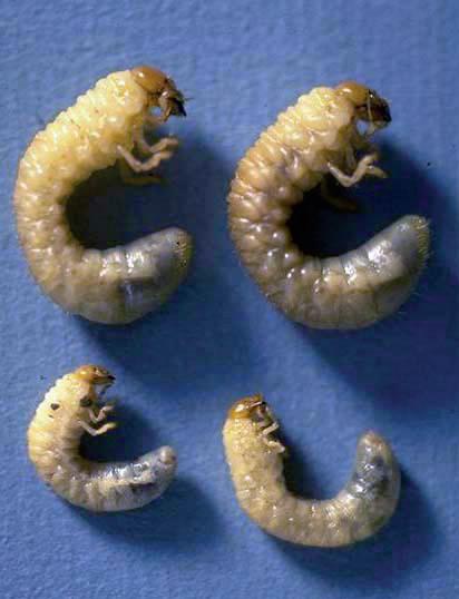 The most severe injury to plants is caused by large (third stage or instar) grubs feeding on roots in the fall and spring. There is no doubt that most every gardener has seen them before. White grubs are frequently encountered when tilling garden soil or by sifting through soil underneath damaged turfgrass. Larval stages eat roots of grasses, vegetables, and ornamental plants.