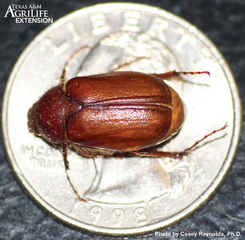 June bugs are a member of the scarab beetle family. There are more than 100 species of scarab beetles from several genera in Texas that are considered to be white grubs, May beetles, and June bugs. However, the most common is Phyllophaga crinita.