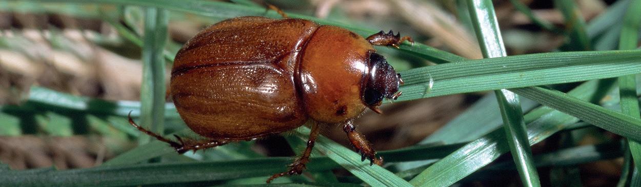 These adult beetles, commonly referred to as June bugs or May beetles, are ½ to 5/8 inches long and reddish brown. Their very destructive larvae are the common grub worms in the soil. These grub worms are the white “C”-shaped larvae, up to 1 inch long, with cream-colored bodies and brown head capsules. As a true insect, they have three pairs of legs, one on each of the first three segments behind the head.