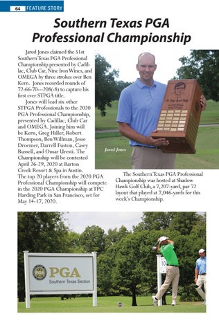 Southern Texas PGA Professional Championship Jared Jones claimed the 51st Southern Texas PGA Professional Championship presented by Cadillac, Club Car, Nine Iron Wines, and OMEGA by three strokes over Ben Kern. Jones recorded rounds of 72-66-70---208(-8) to capture his first ever STPGA title. Jones will lead six other STPGA Professionals to the 2020 PGA Professional Championship, presented by Cadillac, Club Car and OMEGA. Joining him will be Kern, Greg Hiller, Robert Thompson, Ben Willman, Jesse Droemer, Darrell Fuston, Casey Jared Jones Russell, and Omar Uresti. The Championship will be contested April 26-29, 2020 at Barton Creek Resort & Spa in Austin. The Southern Texas PGA Professional The top 20 players from the 2020 PGA Championship was hosted at Shadow Professional Championship will compete Hawk Golf Club, a 7,207-yard, par 72 in the 2020 PGA Championship at TPC layout that played at 7,046-yards for this Harding Park in San Francisco, set for week’s Championship. May 14-17, 2020.