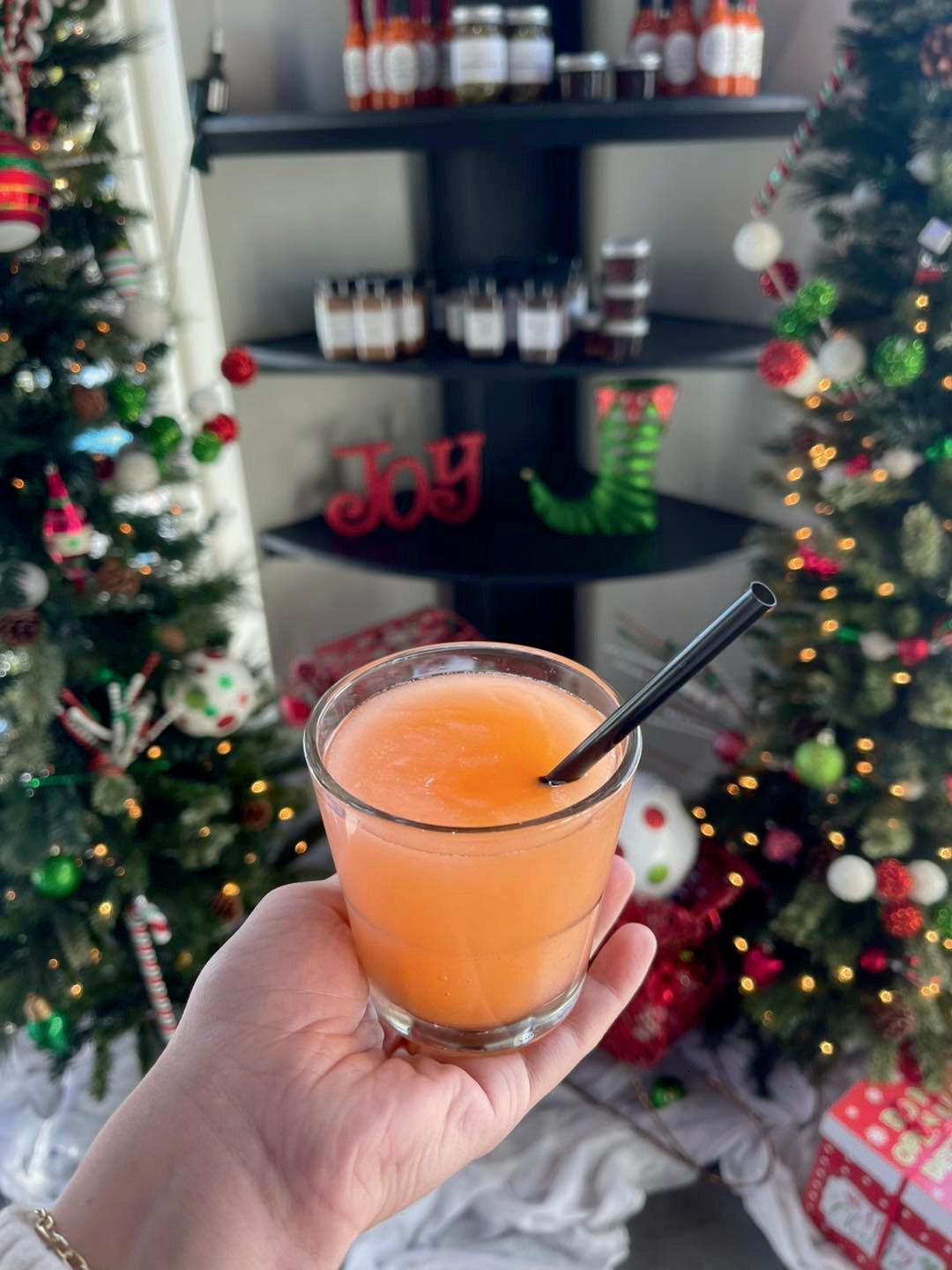 4. Squeeze orange into the mixture, and top with cherries.