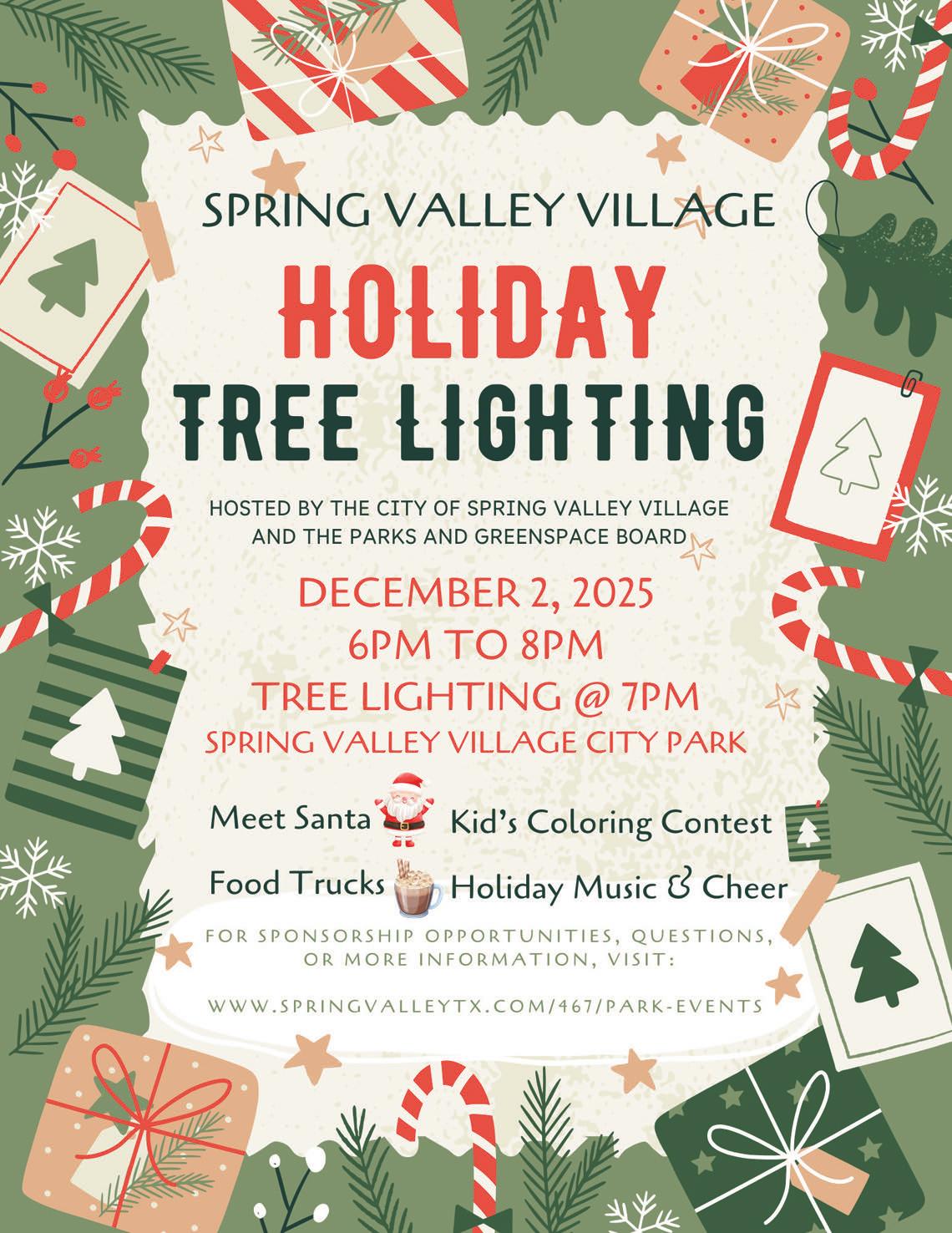 Holiday Tree Lighting 6 PM, Spring Valley Village Teen Quiet Study Hour 4:30 PM, Ages 13-18, SB Memorial Library