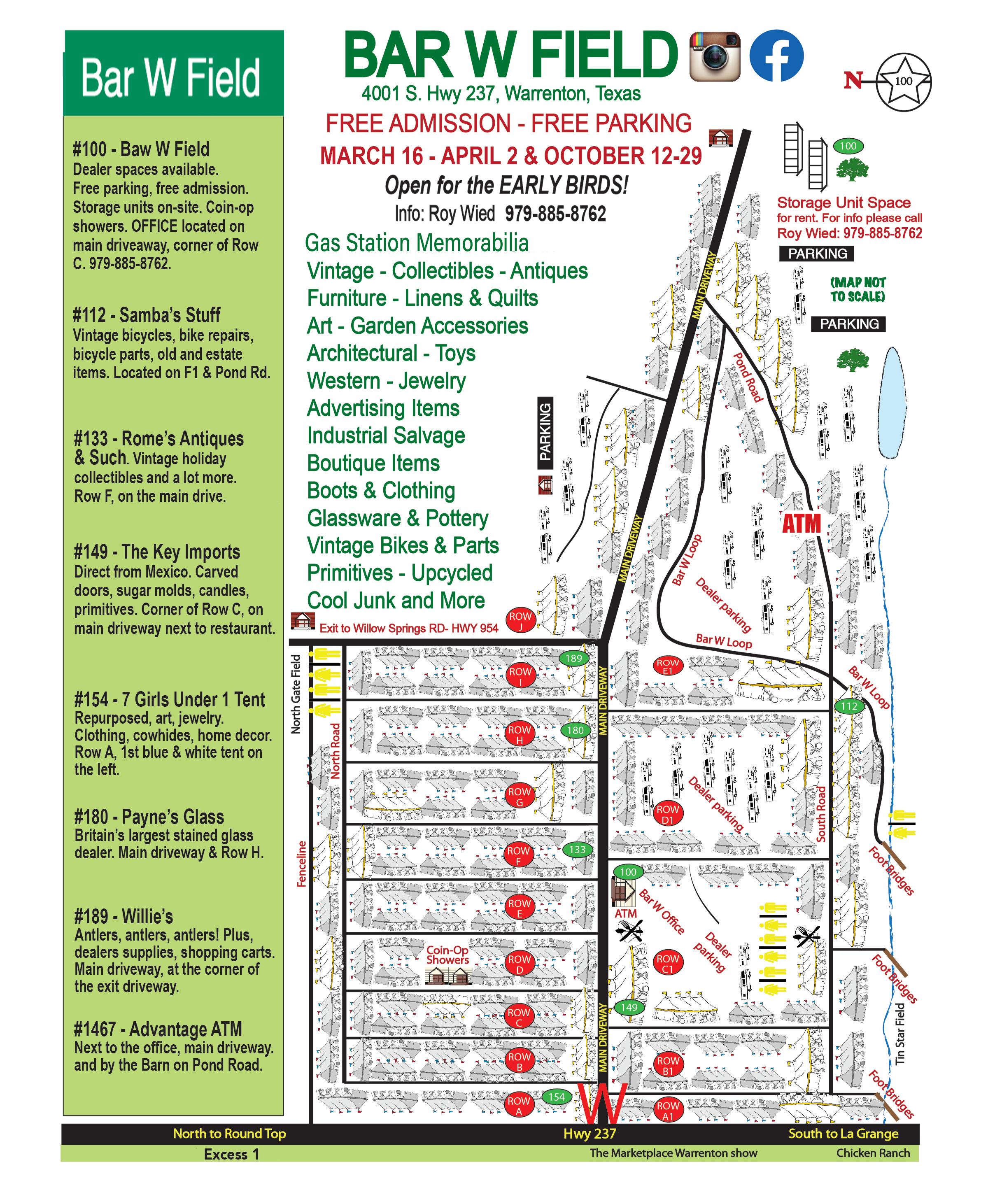 Show Daily has a big 8-page fold-out map at the centerfold. It pinpoints every venue location between La Grange and Brenham. The magazine is set up just like the physical show area. We start at the north side of Warrenton and move south through town, cross the highway and head back north again. As one continues through the magazine, the layout matches the actual geography of the show area, heading south to north through Round Top, Carmine and on to Burton (with a short side-jaunt to Fayetteville).