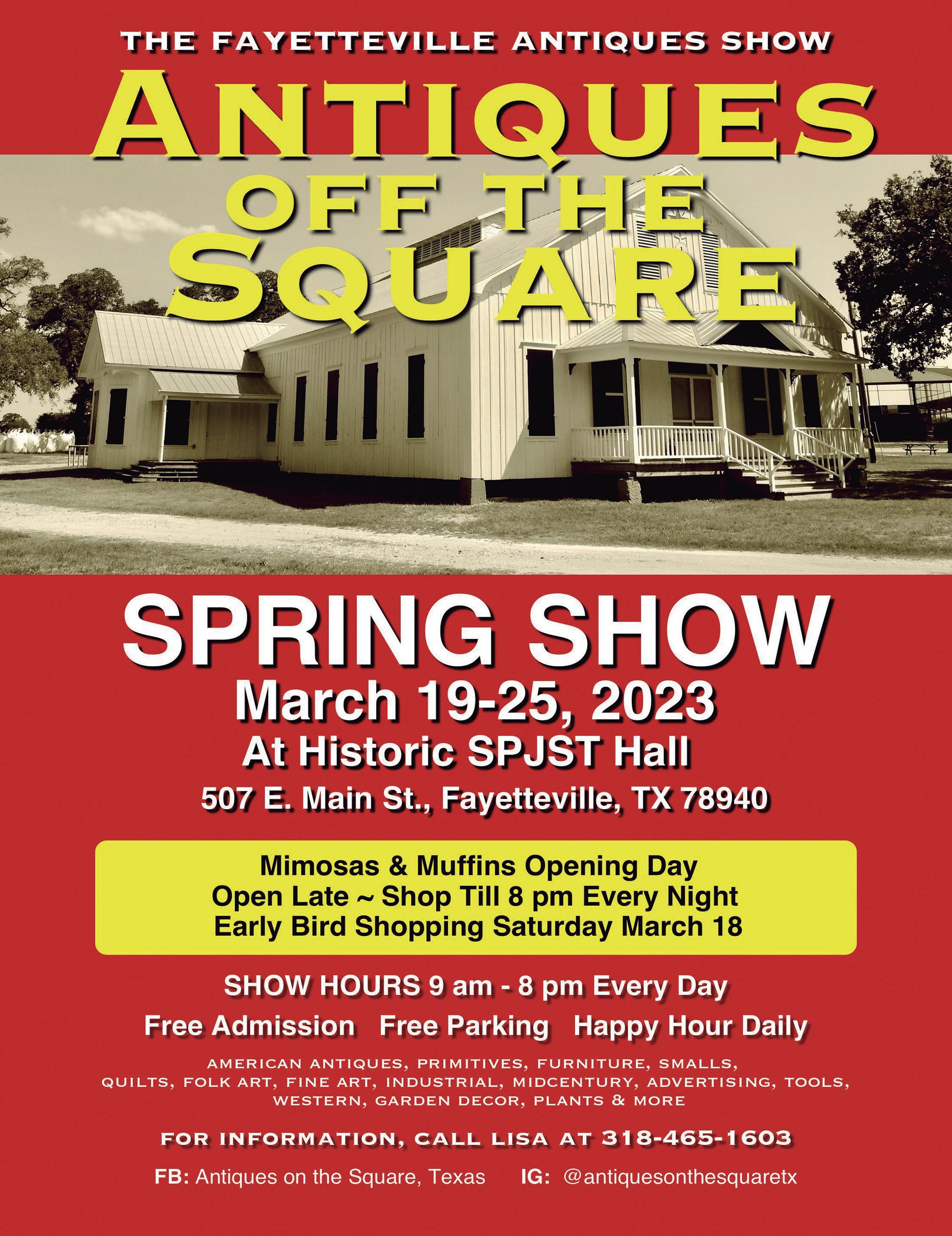 While speaking with Mike Stroup, Mayor of Fayetteville, he states, “The bi-annual Antiques Shows in Fayette County, Winter Show, bring not shoppers and overnighters to the Round Top/Warrenton area, but they also have a positive effect on the surrounding towns like Fayetteville. Many shoppers and vendors stay and dine in Fayetteville, sometimes over the length of the shows. There’s also the “Off the Square Antique Show,” at the SPJST Hall that