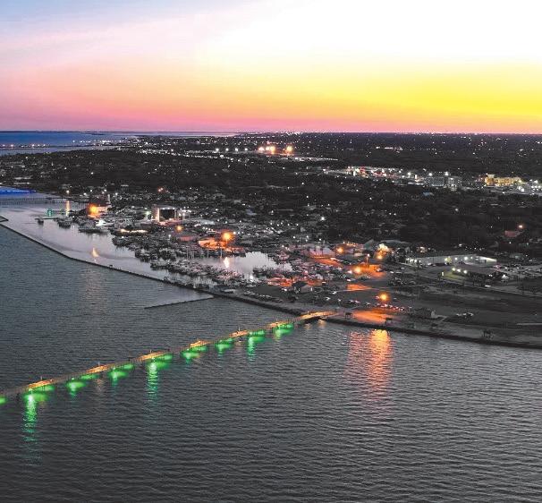 the new pier glows with LED lights that illuminate the waters of Aransas Bay for latenight anglers. Open 24 hours a day, it welcomes families, visitors, and serious fishers alike for a $5-per-rod fee.