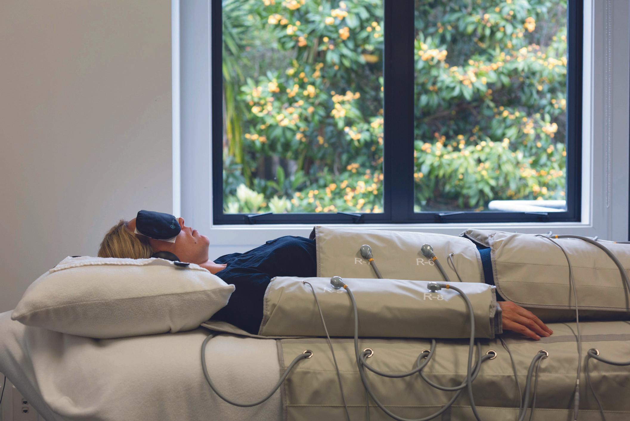 Infared heat combined with compression and deep pressure, similar to the effect of a weighed blanket. Some people come out of it feeling like they’ve been massaged by four people. It can be fine tuned to the kind of pressure the client wants. “There’s something about it that puts people in the deepest parasympathetic state. It’s resetting the nervous system and helping to heal the body.