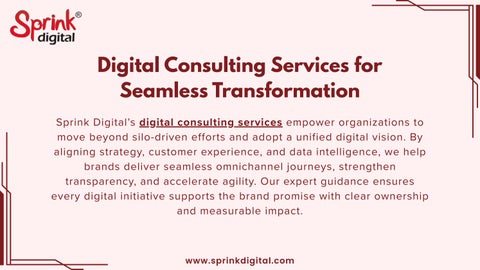 Sprink Digital ’s digital consulting services empower organizations to move beyond silo - driven efforts and adopt a unified digital vision . By aligning strategy, customer experience, and data intelligence, we help brands deliver seamless omnichannel journeys , strengthen transparency, and accelerate agility. Our expert guidance ensures every digital initiative supports the brand promise with clear ownership and measurable impact .