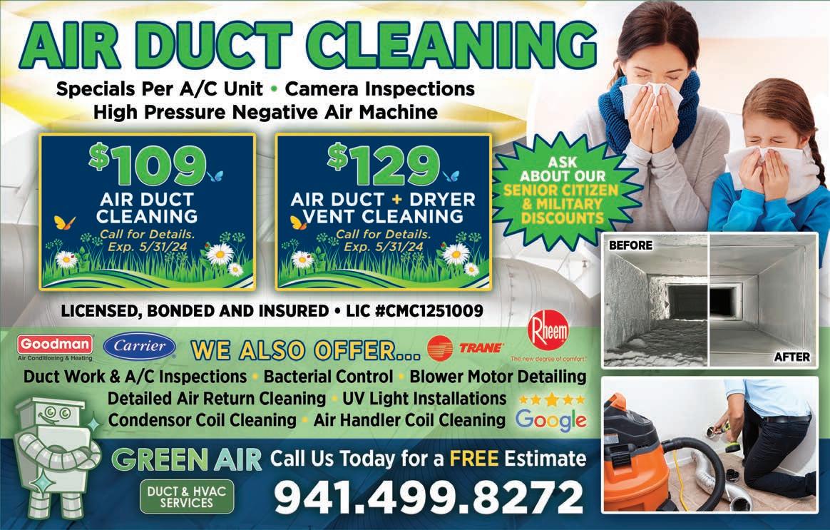 THE HOME MAG - May 2024 SHOWCASING THE BEST HOME IMPROVEMENT COMPANIES 21 FreshAirProsFlo.com FreshAirProsFl@gmail.com FR EE ESTIM ATES No Obl i ga t ion No H i dden Fees Licensed & In sured ! 941-225-2026 Open Sun - Fri Fresh Air Be ca use Y OU Ca re! AIR DUCT & DRYER VENT CLEANING PACKAGE $115 Reg. $350 Expires 06/15/2024 UNLIMITED DUCTS PER A/C UNIT - CAMERA INSPECTIONHIGH PRESSURE NEGATIVE AIR MACHINE Prevent dryer lint blockage & extend the life of your dryer AIR DUCT CLEANING PACKAGE $95 Reg. $350 Expires 06/15/2024 - UNLIMITED VENTS- HIGH PRESSURE NEGATIVE AIR MACHINE - CAMERA INSPECTION - ORGANIC DEODORIZER - AIR FLOW CHECK - ATTIC INSULATION CHECK- CHIMNEY INSPECTION - A/C UNIT INSPECTION - DUCT WORK INSPECTION ASTHMA, BRONCHITIS, HEADACHES, NASAL CONGESTION, SINUS PROBLEMS, MIGRAINES, MUSTY ODOR? WE CAN HELP! DR YE R VE NT BEFORE AFTER cleaning $145 fireplace SALE Spring SALE Spring