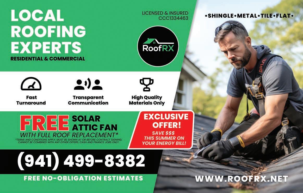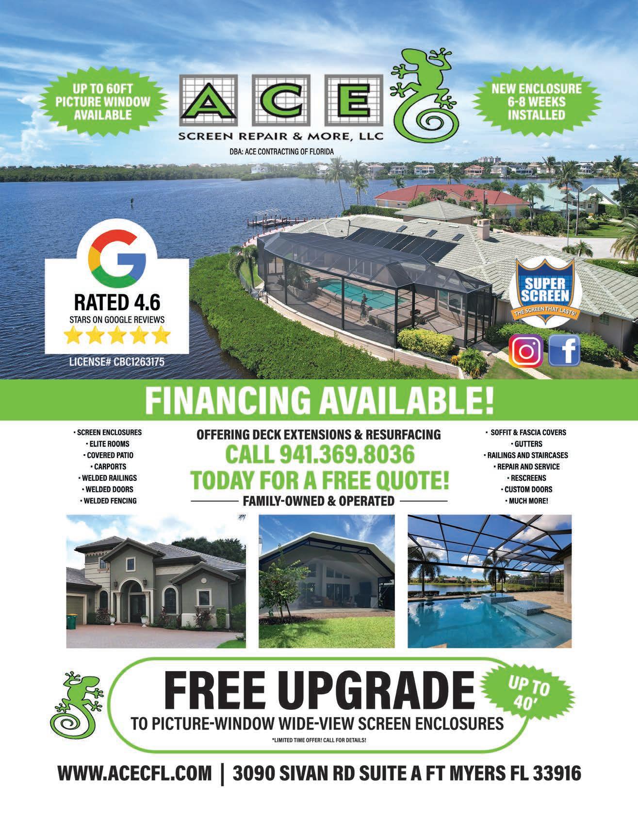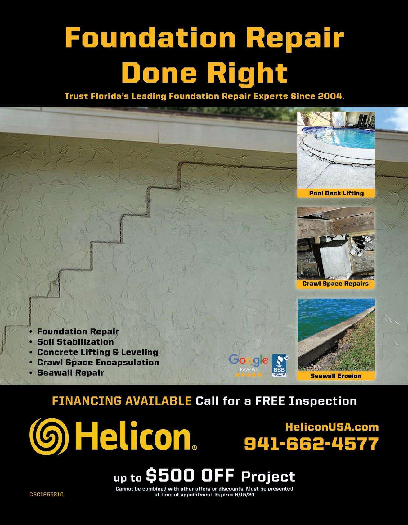 THE HOME MAG - May 2024 SHOWCASING THE BEST HOME SEAL N SHINE PRESSURE WASHING 941.875.8941 www.SealNShineFl.com Family Owned & Operated Licensed & Insured VETERANS DISCOUNT 10% 941.444.6235 CALL TODAY! W indows • Doors • Shutters • Lanai Enclosures Roll Downs • Accordions • Clear Panels Hurricane Screens • Impact Windows & Doors HighWindShutters.com Licensed & Insured Lic#CGC1523911 $ 350 OFF WITH ANY NEW ORDER Ask Us About the shield --Strong & Versatile --See Through Protection from Sun, Rain, Wind, Insects & Violent Hurricanes BEST PRICES IN TOWN POOL CAGE AND POOL DECK CONSTRUCTION AND RESTORATION Restore It or Rebuild It! 941-400-0662 REPAIR / REPAINT / RESCREEN See our list of services & video on pool cage restoration at OspreyProScreen.com To Fast Track Fill Out Our Form At www.OspreyProScreen.com Osprey Pro Screen Family owned Est. 2008