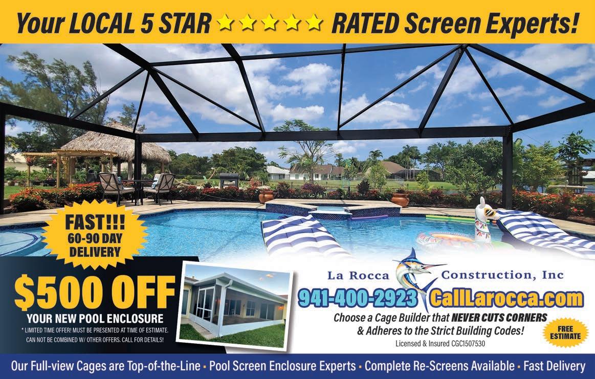 20 THE HOME MAG - May 2024 SHOWCASING THE BEST HOME IMPROVEMENT COMPANIES Call for a FREE ESTIMATE 941- 699 - 66 37 Motorized Roll-up Screens LET THE AIR IN WHILE KEEPING THE BUGS & CRITTERS OUT! Based out of Port Charlotte, Serving Garage Screens of SWFL, LLC of Sarasota II, LLC SUMMER SPECIALS CUSTOM BUILT Garage • Lanai • Resaurant/Commercial Buildings Motorized & Remote Control Roll-up Screens for your: Turn yo ur backyar d into an Oasi s with a lovely new pool or spa from the experts at Primo Pools & Spas Fam ily O wne d & O per a te d Si nce 2 00 7 • Re sid ent ial & C ommerc ia l NE W P OOL & S PA CON STRU C TIO N • P OOL R EN OVATIONS & R EPAIRS • P OOL MAI NTE NAN CE 941-625-6481 • 20020 Vet era ns Bl vd , Un i t 5 , Po r t Ch ar lo tt e • P rim oPool s An d Sp as .com CBC1264224, CPC1457430, CPC1459551