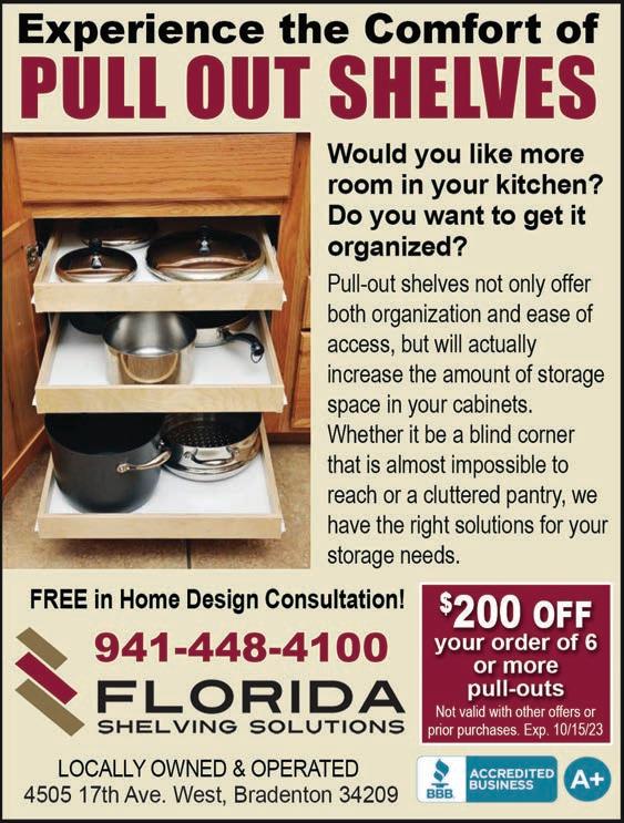 THE HOME MAG - SEPTEMBER 2023 SHOWCASING THE BEST HOME IMPROVEMENT COMPANIES 63 sh elvin g & rack s • cabinets • ov erhea d storag e • flooring CONTACT US TODAY FOR A FREE CONSULTATION AND ESTIMATE 941-348-1987 | ww w.StorProNow.com IT’S TIME TO GET ORGANIZED Any Job Over $2000. Call for details. Exp 10/12/23.