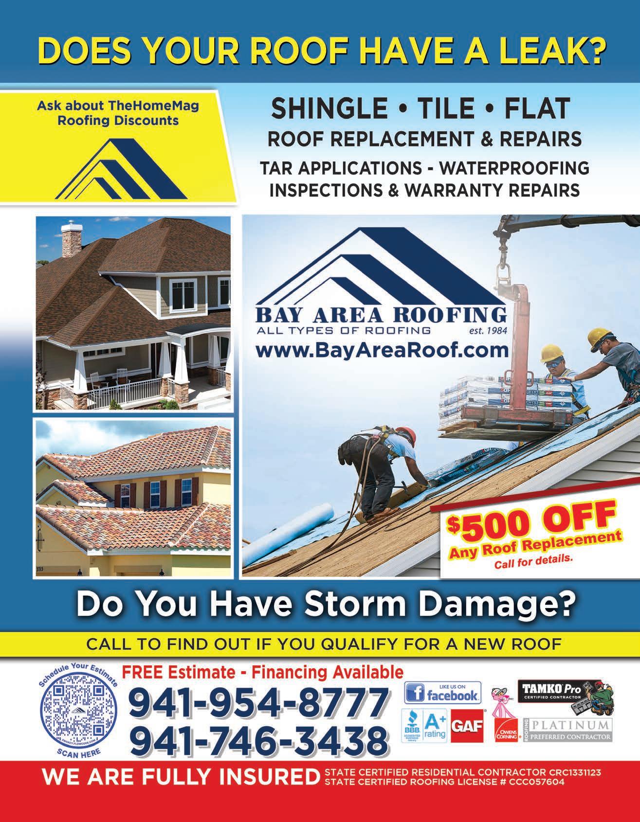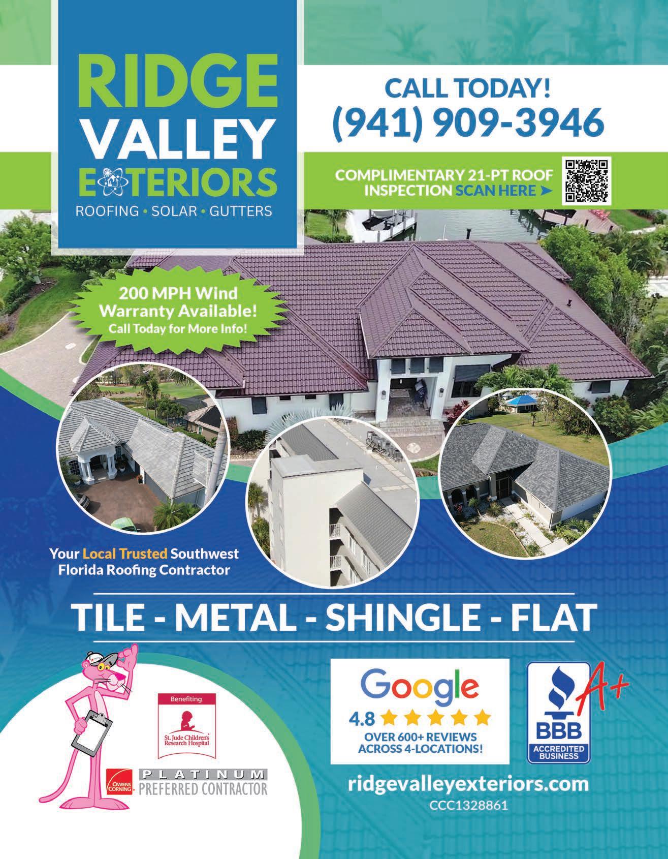 8 THE HOME MAG - SEPTEMBER 2023 SHOWCASING THE BEST HOME IMPROVEMENT COMPANIES Southwest Florida’s Finest Landscape Lighting Company FREE DESIGN & ESTIMATE 941-225-2811 PleasantLightscapes.com Lic. & Ins #ES12000766 FAMILY OWNED DETAREPODNA For 20 years Roof Maxx is a quick, natural and affordable alterna�ve to a complicated, expensive and life-disrup�ng asphalt roof replacement. On average, a Roof Maxx Treatment cost 75-80% LESS than Roof Replacement CALL TODAY FOR FREE CONSULTATION 941-780-6826 MORE LIFE. LESS MONEY. GUARANTEED. GREATER SARASOTA / MANATEE AREA Roofmaxx.us/Sarasota-fl · 5 YEAR STATE ROOF INSURANCE CERTIFICATION · 5 YEAR ROOF MAXX WARRANTY NOW SAVING TILE & METAL ROOFS