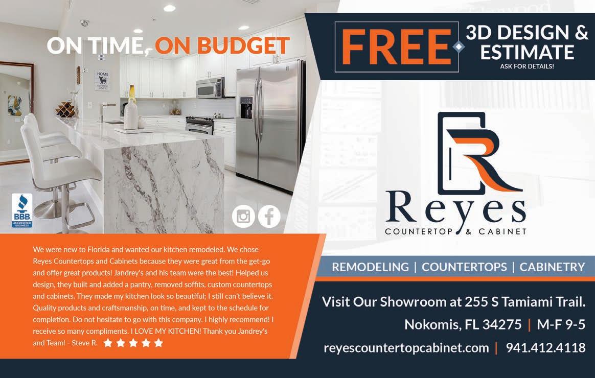 2 THE HOME MAG - SEPTEMBER 2023 SHOWCASING THE BEST HOME IMPROVEMENT COMPANIES • 78 0 N . T AM I AM I TRL, NOKOMIS Visit our 800 sq. ft. Display Showroom Today! www.SunshineGranite.com sunshinegranitefl@gmail.com Licensed & Insured G RA NIT E • MARBL E • ON YX • QUARTZ 941 . 264 . 984 0 941.681.0607 We also Service, Repair and Seal Your Hard Surfaces! WE I NSTA LL T ILE B AC KSPLA SHE S Com e v isi t us for C o m e v isi t us for MORE SPECIAL PR OMOT IO NS! MORE SPECIAL PR O M O T IO N S ! 50% O FF RE MNANT S! R E MNANT S ! 5 0 % O F F SALE! GRANITE $3499/sf Starting Price In Stock SPECIAL! QUARTZ $4999/sf Starting Price In Stock 20% OFF Countertop Sealer Exp. 10/15/23