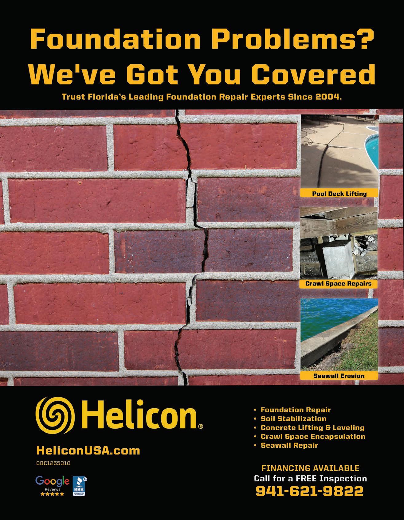 44S THE HOME MAG - SEPTEMBER 2023 SHOWCASING THE BEST HOME IMPROVEMENT COMPANIES Expires 10-12-23. Cannot be combined with any other offer. Offer is only good for TheHomeMag recipients and must give voucher number. THM-SRQ-SEPT Expires 10-12-23. Cannot be combined with any other offer. Offer is only good for TheHomeMag recipients and must give voucher number. THM-SRQ-SEPT LIMITED TIME OFFER $500 OFF * GET A FREE INSPECTION *Ten percent off any job over $2500 up to a max of $500. Coupon must be presented at time of inspection. Offer may not be combined with any other offer. Limit one per customer. Ask inspector for further details. Promo valid through 9/30/2023. BECAUSE YOUR FOUNDATION IS CRACKED. 941-841-1494 FOUNDATION REPAIR CRAWL SPACE REPAIR CONCRETE LIFTING HIC#CBC1257350