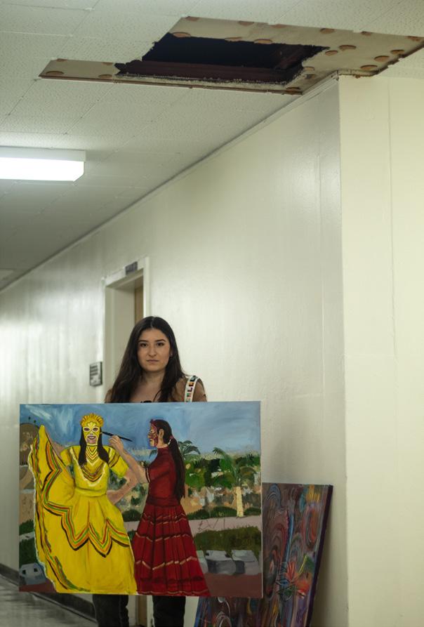 Carolina holds a piece of her artwork under a hole in the ceiling. Multiple spots in the ceilings of the hallways of the Fine Arts building have gaping holes. Photo by Kelsey Brown.