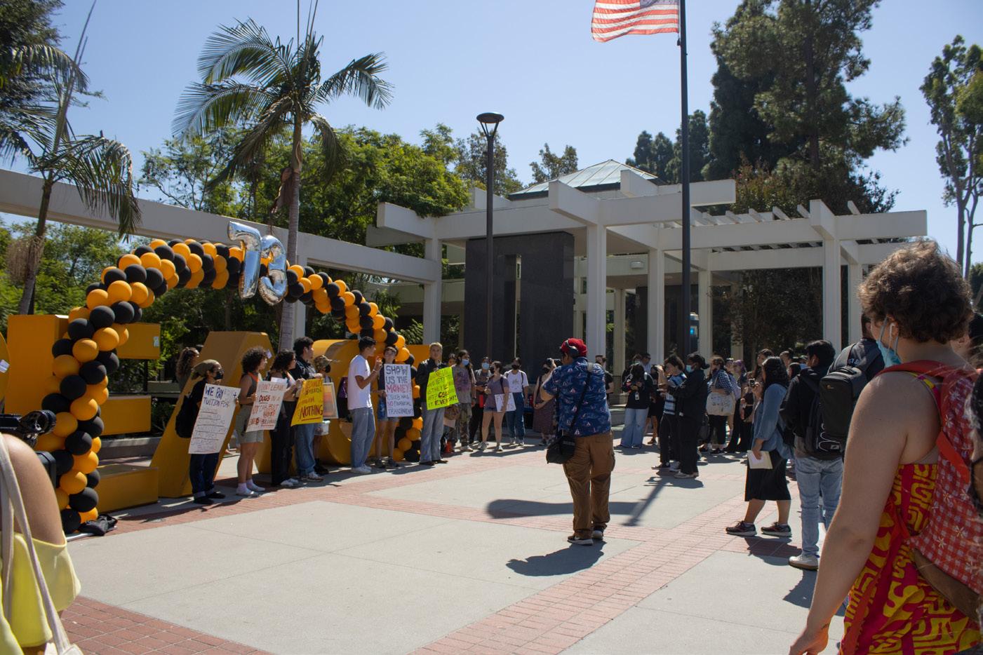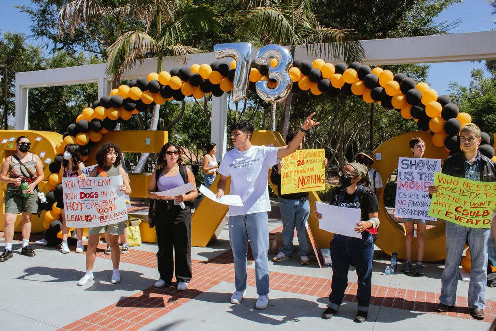 On Sept. 28, 2022, a group of art students held a protest at the Go Beach sign by the university’s roundabout. Crowds gathered to hear their stories, taking away attention from a nearby alumni event. Photo by Vittina Ibanez.