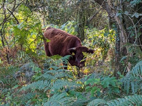 “RedDevonsteergrazinginthewoodsatTrinityHillLocalNatureReserve.WhenIcameunexpectedly acrosshimwhenIwasgoingforawalk,Iwasstruckbythethoughtthat(ignoringtheeartagsand trackercollar)onecouldalmosthavebeenbackintime,whenwildcattlebrowsedtheforest. Theanimal’sstance,withheadloweredtoseeunderthebranches,isverytypical.