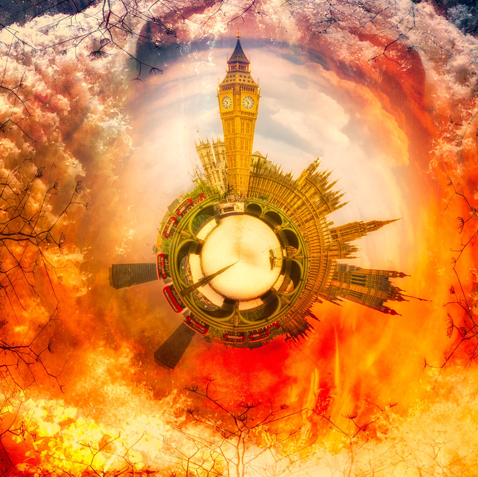 In the top section, raging seas are about to engulf London, whilst the heat of the fire in the bottom part of the picture is spreading and starting to impact the population. Around the edges, dead foliage speaks of the damage already done.