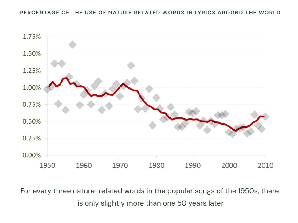 to nature have been decreasing steadily in fiction books, song lyrics, and film storylines since the 1950s.