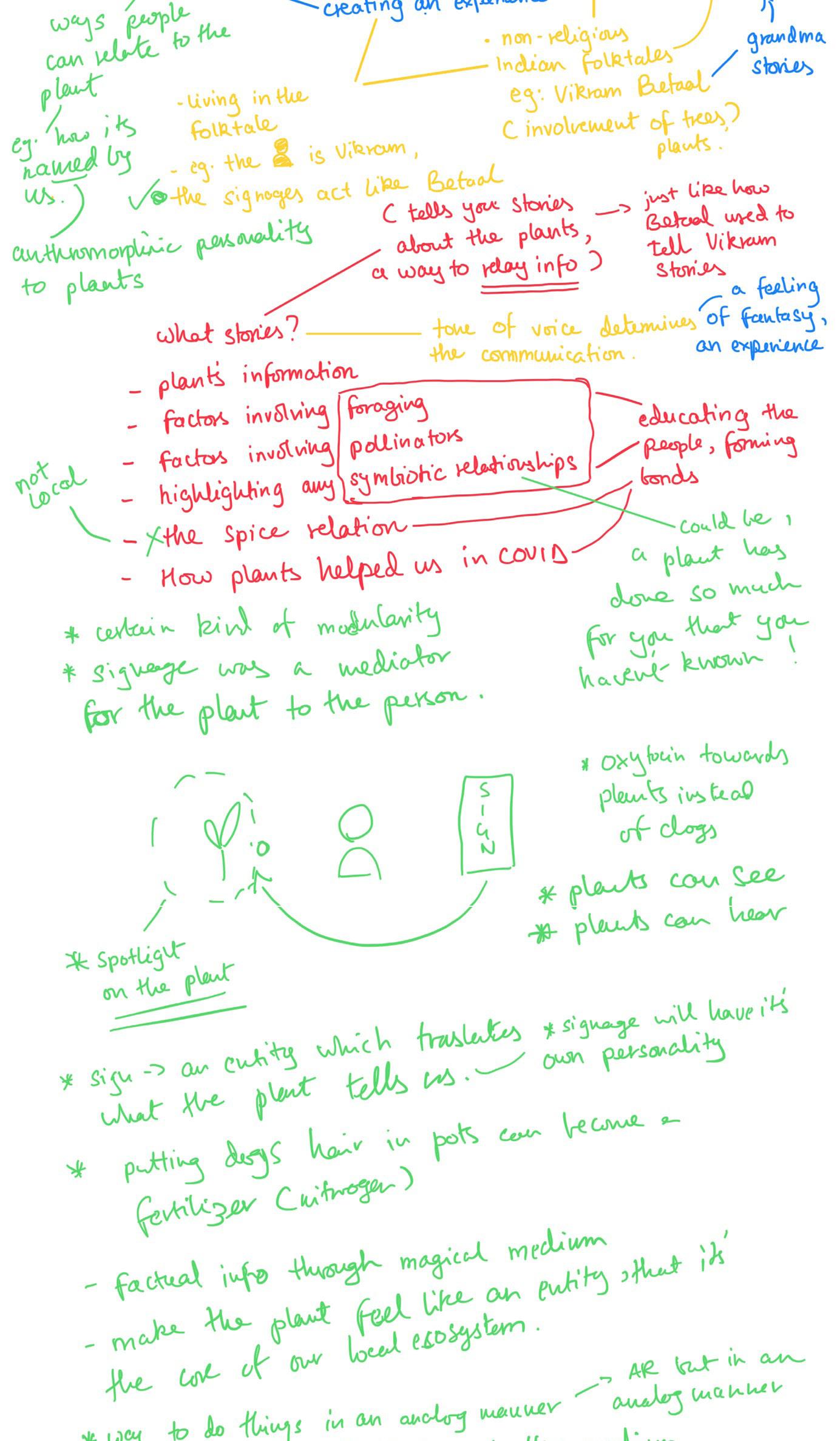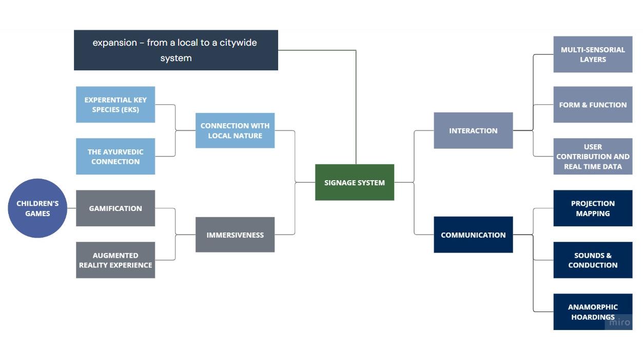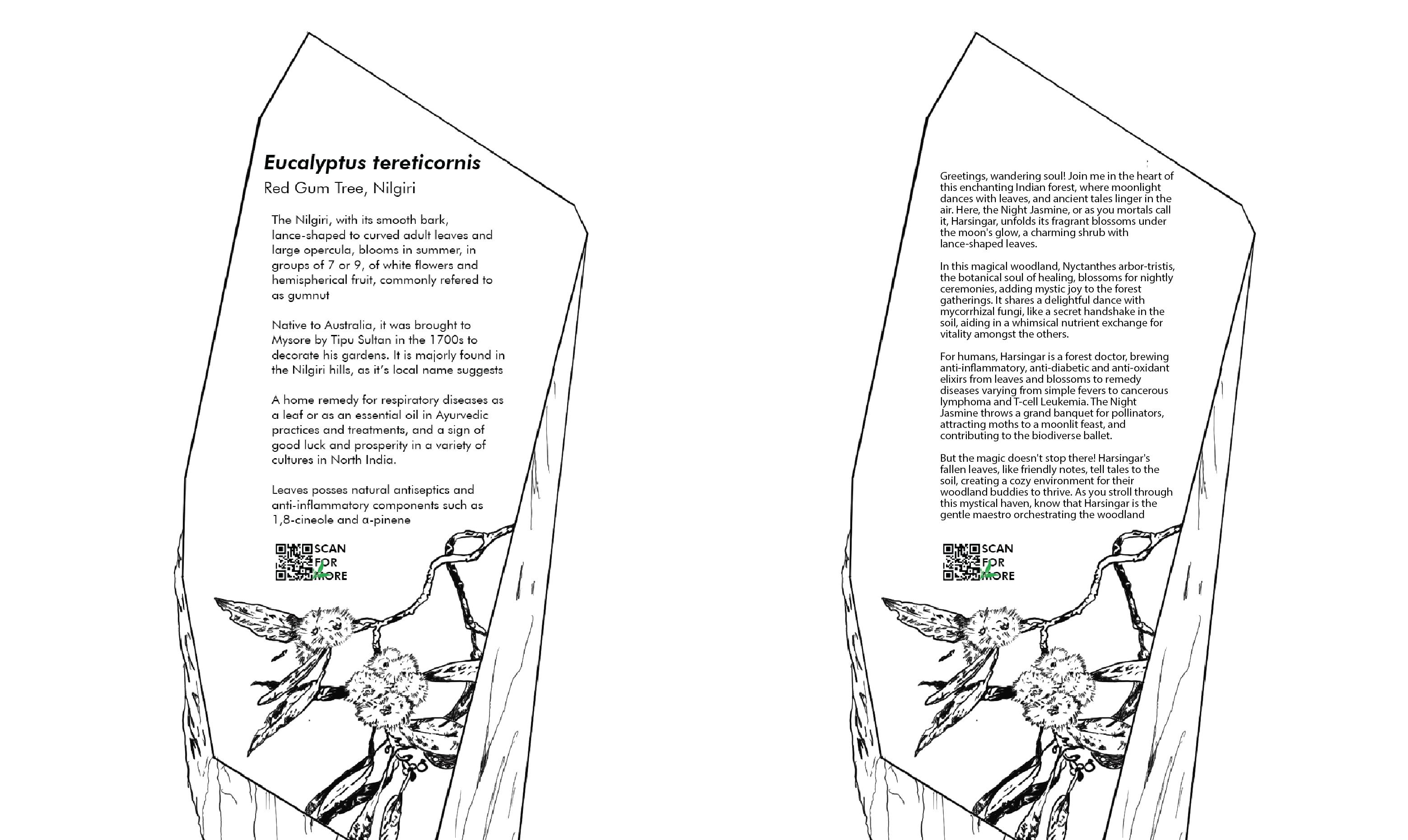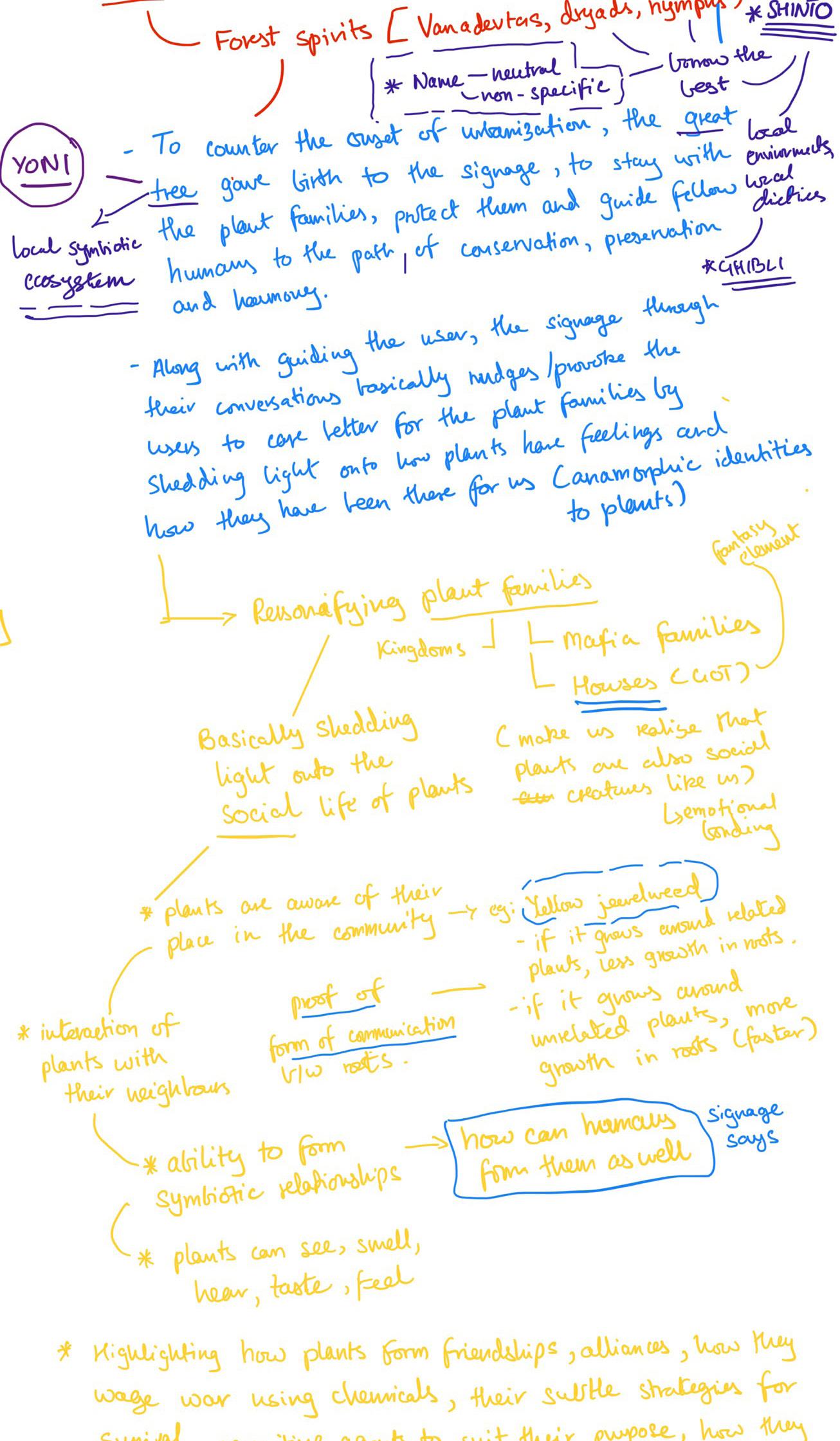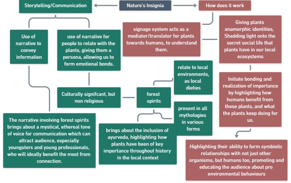 The narrative kicks off with how to counter the onset of urbanization and digitization, the yoni (local ecosystem where the signage will be placed) gave birth to the forest spirits (the signage), to stay with the plant families, protext them and guide fellow humans to the path of harmony, and help them in understanding that plants too have thier place in the community.