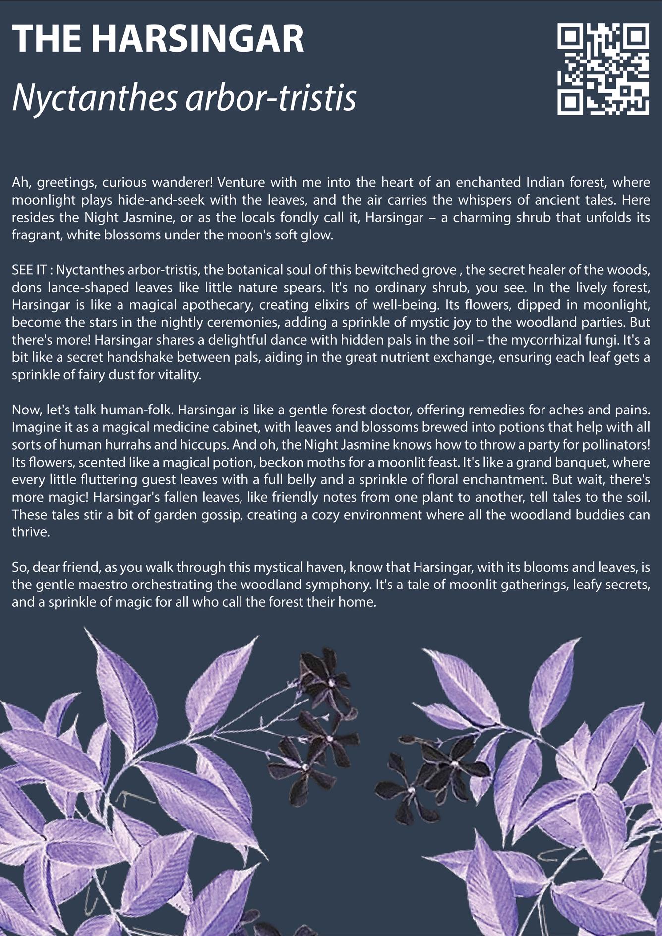 In this magical woodland, Nyctanthes arbor-tristis, the botanical soul of healing, blossoms for nightly ceremonies, adding mystic joy to the forest gatherings. It shares a delightful dance with mycorrhizal fungi, like a secret handshake in the soil, aiding in a whimsical nutrient exchange for vitality amongst the others. For humans, Harsingar is a forest doctor, brewing anti-inflammatory, anti-diabetic and anti-oxidant elixirs from leaves and blossoms to remedy diseases varying from simple fevers to cancerous lymphoma and T-cell Leukemia. The Night Jasmine throws a grand banquet for pollinators, attracting moths to a moonlit feast, and contributing to the biodiverse ballet.