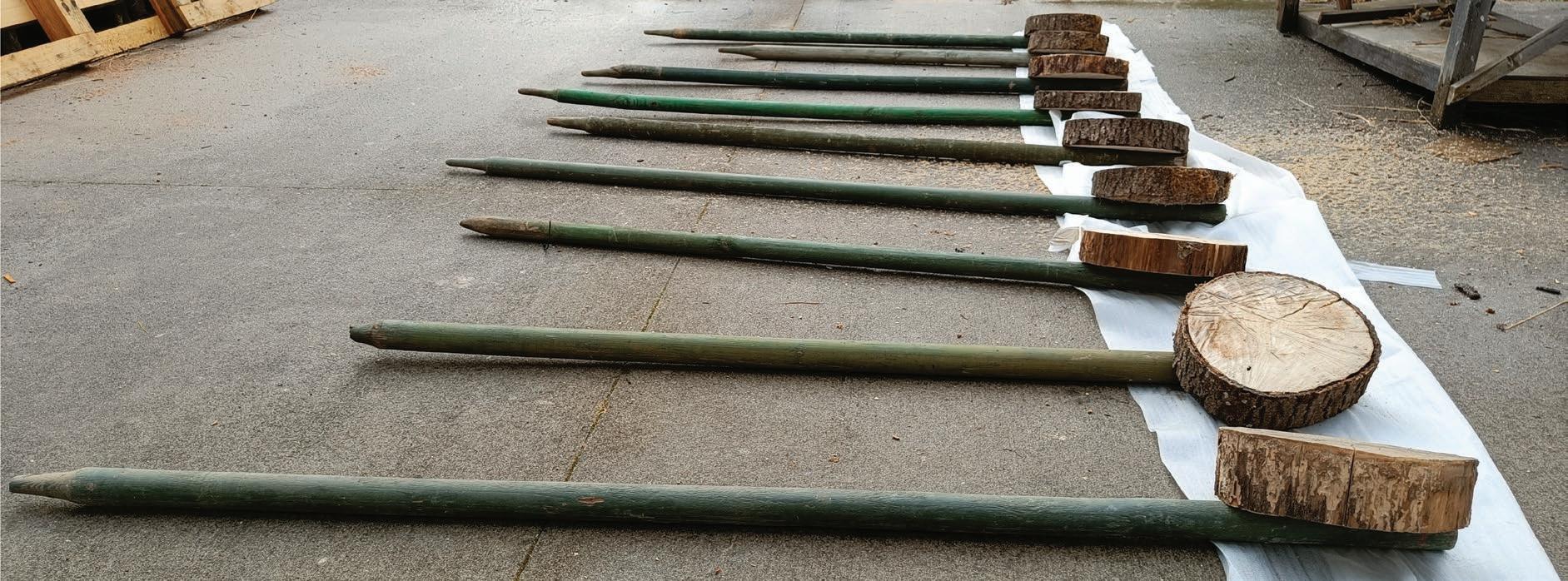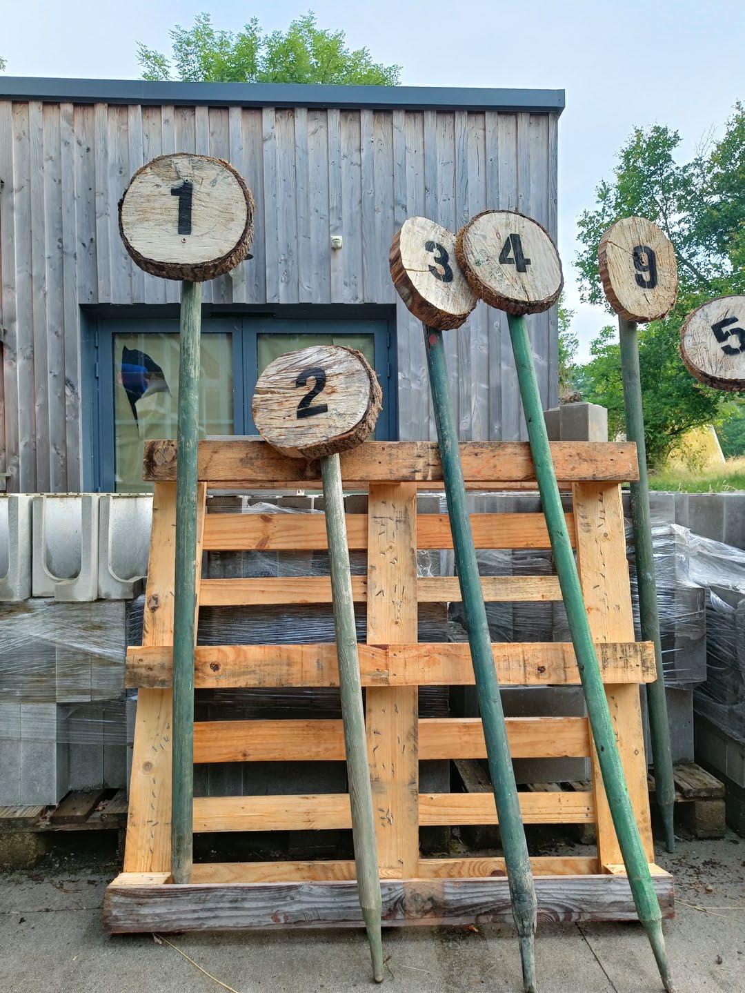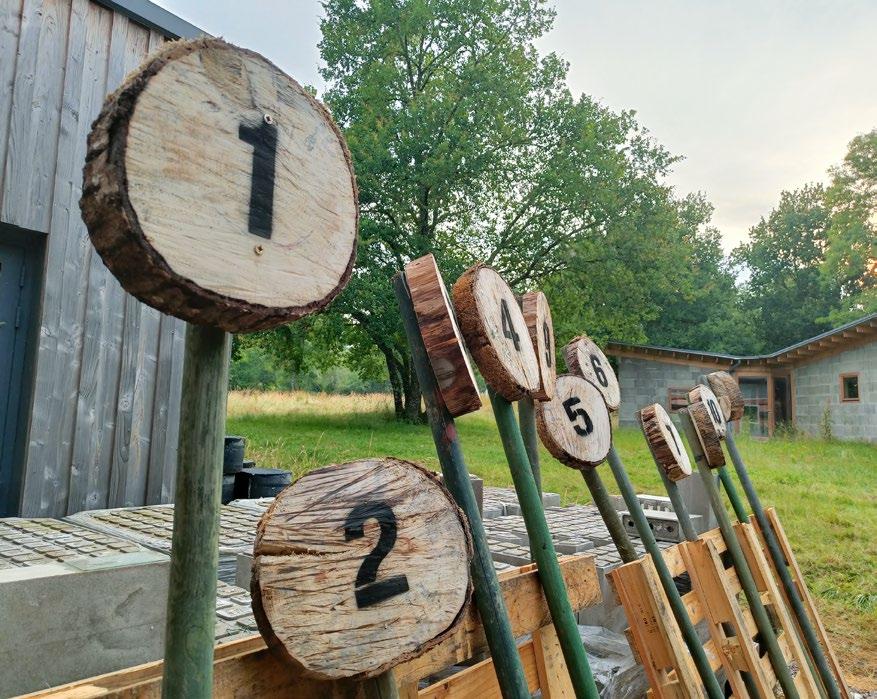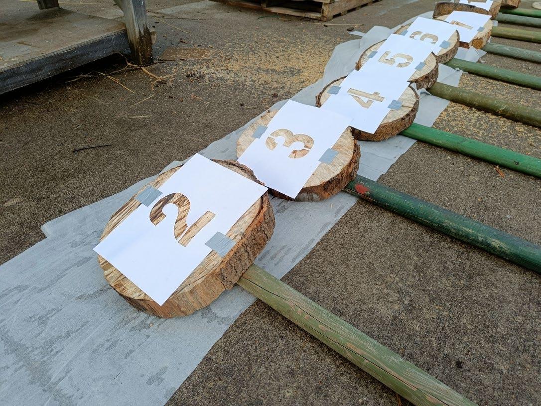 Following Boisbuchet’s minimal look and feel, stencils were designed through which numbers would be painted on the signboards. The materials for this project were all sourced from the natural offering of resources in and around Boisbuchet itself, with sliced wooden trunks and green bamboo sticks as the base structure of the signboards, adding on to Boisbuchet’s drive for sustainability, while being in accordance with the natural theme of the trail.