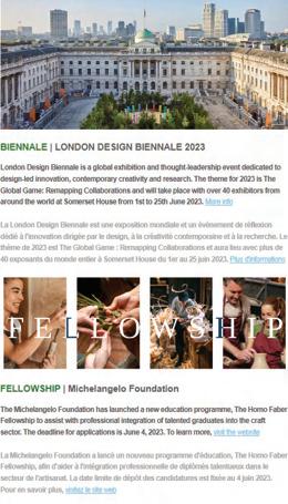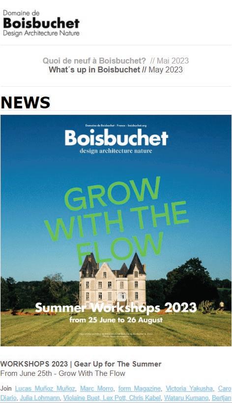 Newsletters were designed and rolled out every month which contained overviews, updates and invitations for events, under the title Quoi de neuf à Boisbuchet? or What’s up in Boisbuchet. Mailchimp was the preffered tool of communication used for these newsletter to be sent out the subscribers. The layout was divided into - news, agenda and press. Along with designing the visual layout according to Boisbuchet’s minimal visual style, curation and writing of content was also a part of the overall process.