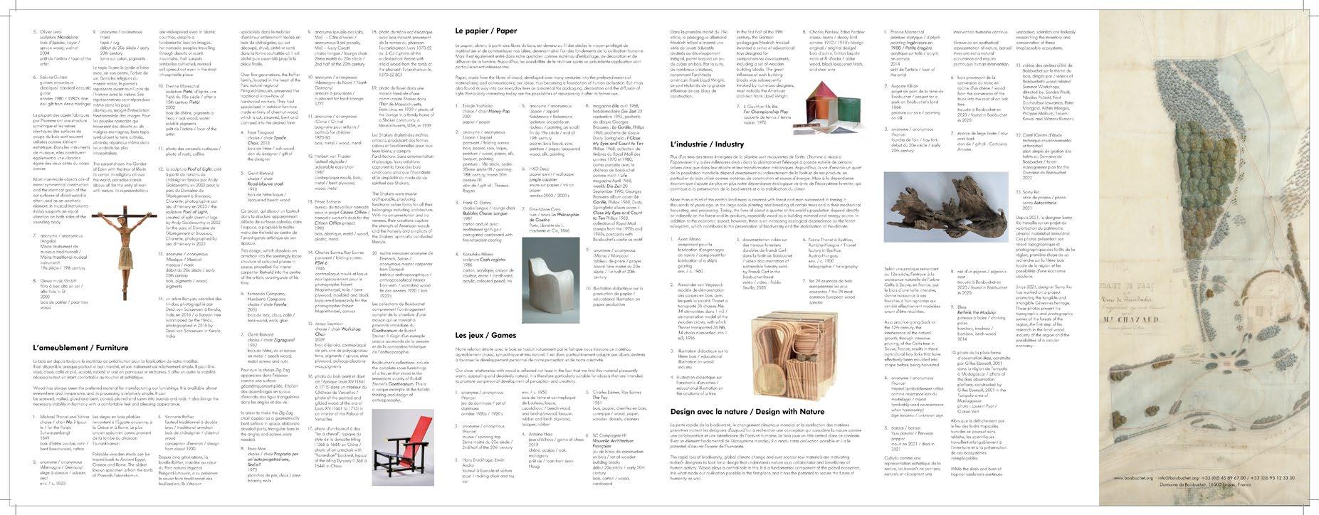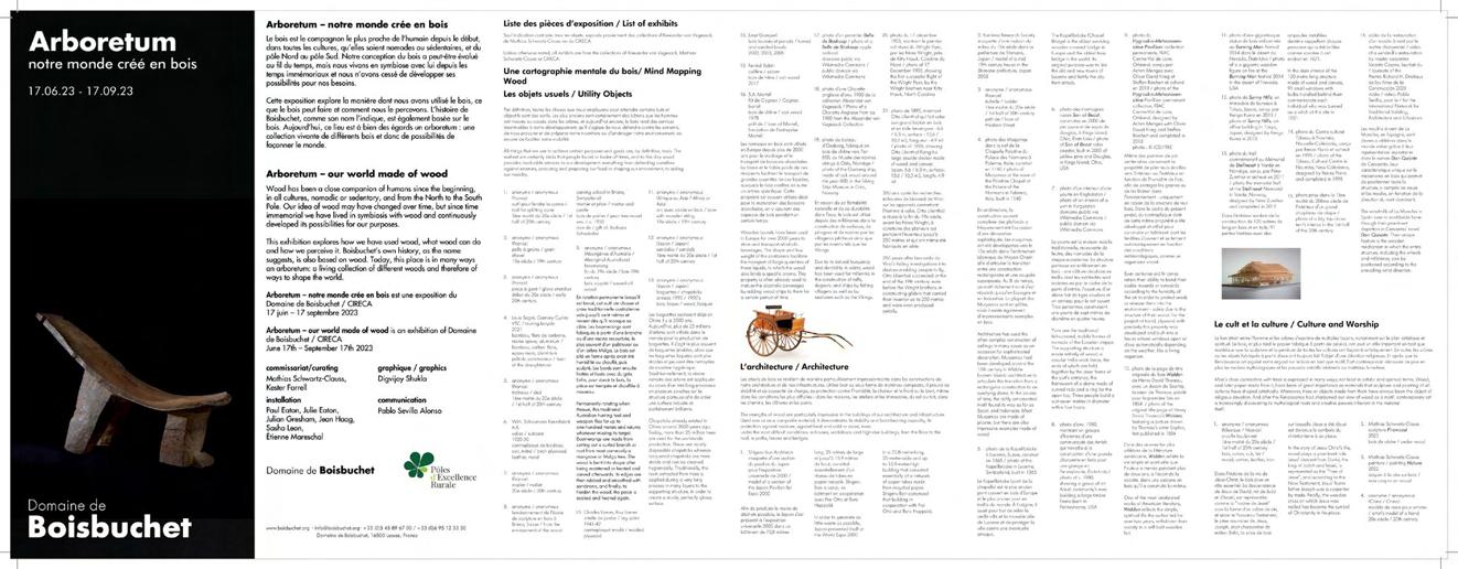 An arboretum is a plantation that displays a variety of trees and shrubs. Boisbuchet has been promoting this diversity for many years and pays tribute to it with this exhibition. Wood has been a key element in the development of design and architecture, and indeed of our entire civilisation; countless, often fundamental innovations have been based on this raw material. However, we have also overexploited it, and today, as we visibly lack biodiversity and even clean air, we realise once again how much we need trees and their wood.