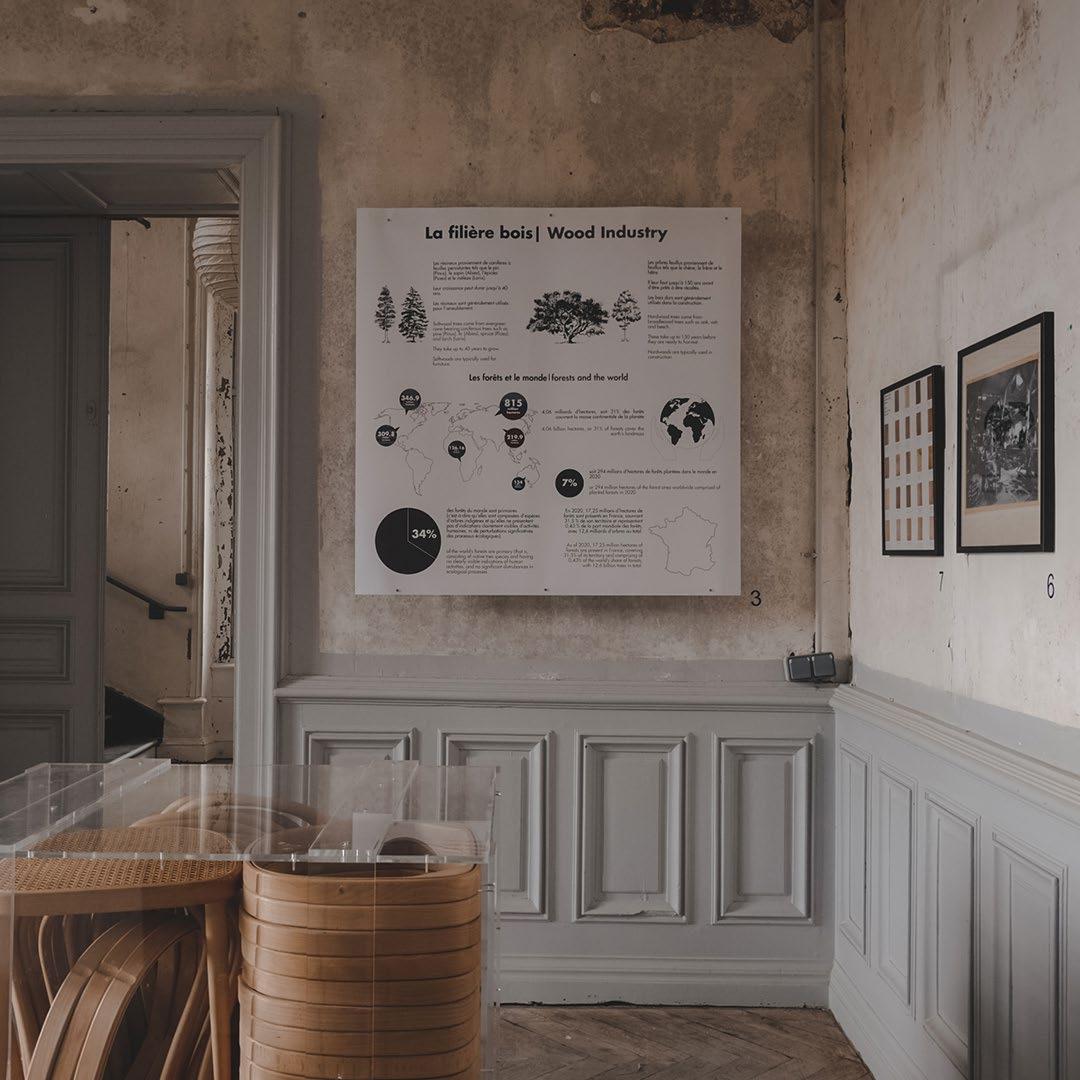 Along with posters and brochures, spatial graphics in the form of infographic panels were also designed for the exhibition. The infographics basically represented statistics and information about the wood and paper industry in France and around the world. Botanical drawings and minimal illustrations were the key point of focus for these graphic elements.