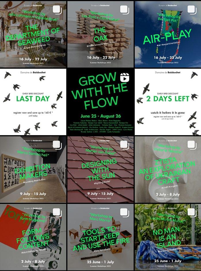 As the Milan Design Week is the largest trade fair of it’s kind in the world, where different furniture, concepts and designs from an international pool of countries are showcased and exhibited, a communicative strategy was designed to help promote the tutors aligned with boisbuchet’s workshop program that were also a part of the MDW 2023 on social media, as a way of mapping collaborators across disciplines, and to highlight the work of our tutors for this year.