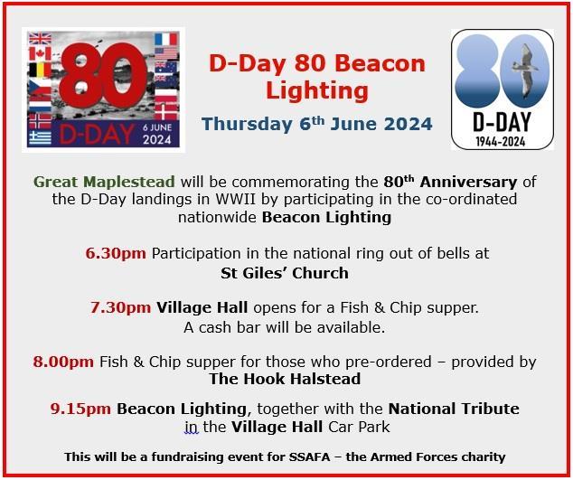 Gestingthorpe Grill* will be open serving Sausages & Burgers. The Village Beacon on Church Green will be lit at 8pm.