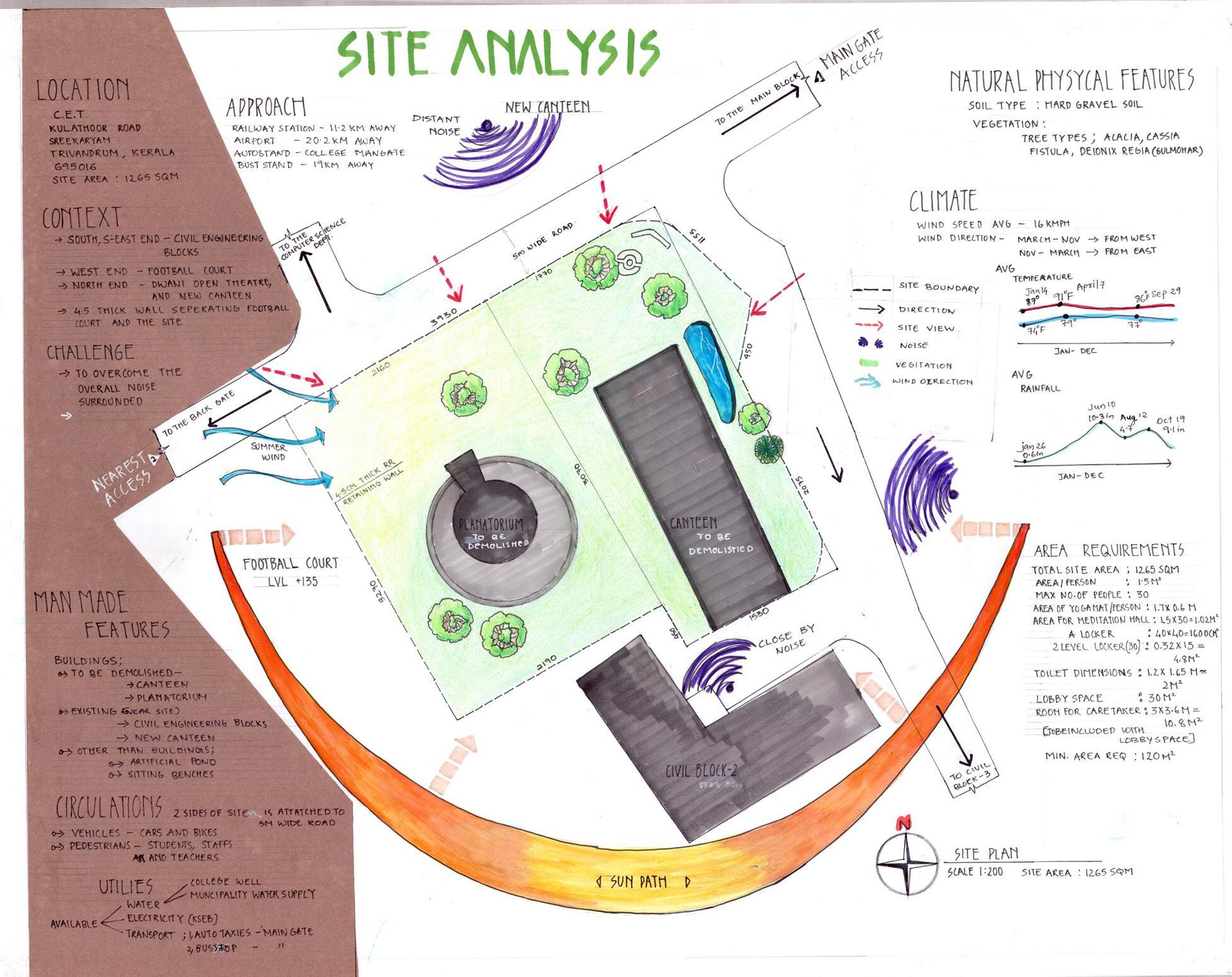 The campus project site, situated near CET campus, is characterized by abundant vegetation and a steep slope towards the west, adjacent to the CET men’s hostel. The analysis of this site, set in the tropical Kerala climate, provides valuable insights for architectural considerations in creating a harmonious and sustainable campus design.