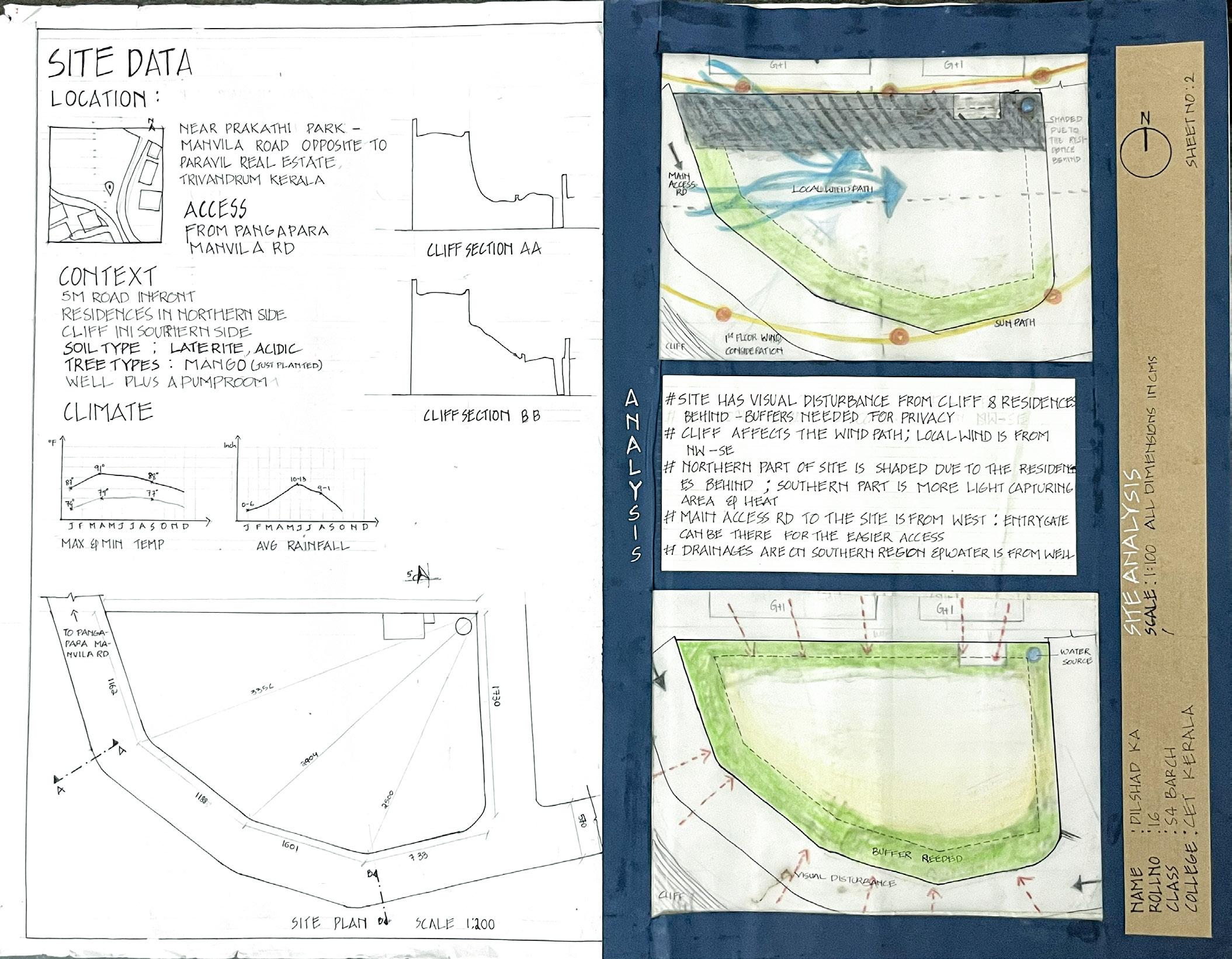 The residential site in Manvila, Trivandrum, features a 6m cliff on its southern side, necessitating attention to privacy concerns regarding views from the cliff to the site. Set in the tropical Kerala climate, this site analysis informs architectural considerations for a contextual residential design project.