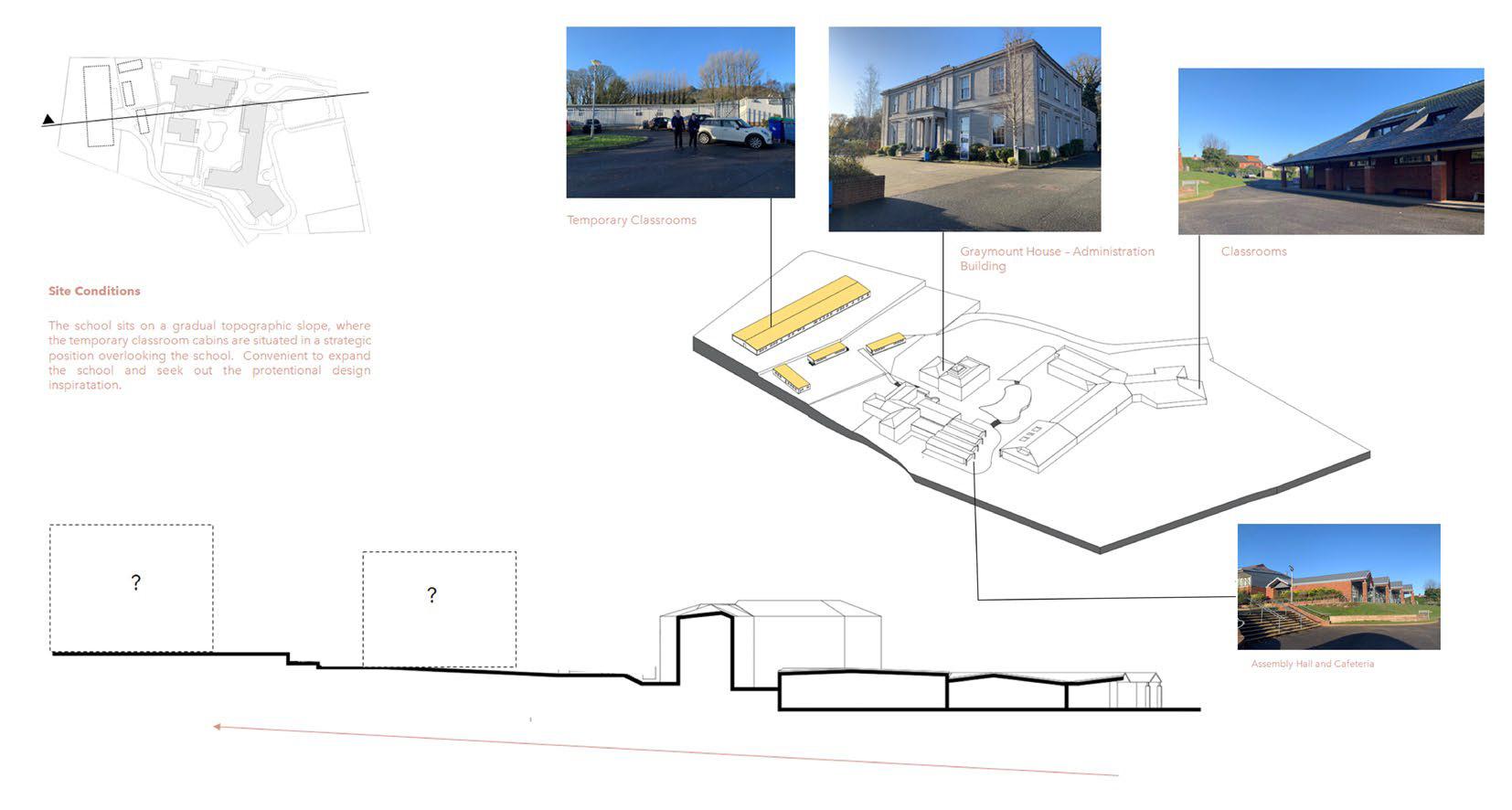 The sec�onal diagram below illustrates where the temporary classrooms are currently located, overlooking the rest of the exis�ng school. Its higher eleva�on from the rest of the site is convenient to place the chaplaincies along with the rest of the classrooms.