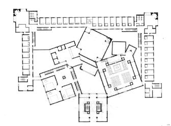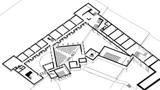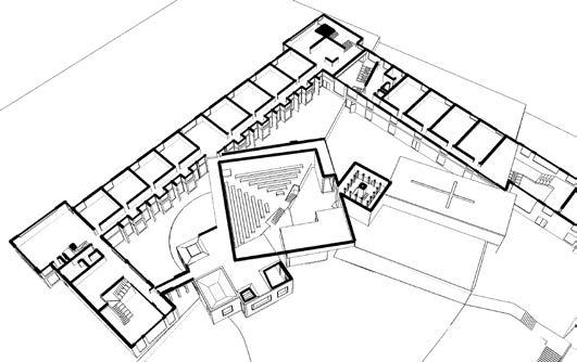 The most ideal precedent I have come across that captured inclusive spaces the most in an accidental yet inten�onal way was Louis Kahn's unbuilt project The Dominican Motherhouse. In that respect, by taking his plans and studying them excessively, I found that it holds a strong resemblance to how the hazelwood integrated college will turn out to be by using its exis�ng building and extending its classrooms around the administra�on building. Subsequently, it will form another courtyard for children to play as shown in the above diagram. Furthemore, since a chaplaincy is missing from the school, rather than have a single space for all religious students to prac�ce their faiths, challenging the idea of having three separate ones, each represen�ng the Protestant, Catholic and other faiths respec�vely, will be the new typology for new integrated schools to consider when establishing one. Their disposi�ons will be interconnected at the ends and corners of their geometric forms, mirroring the tensions built in the monastery project of Louis Kahn's.