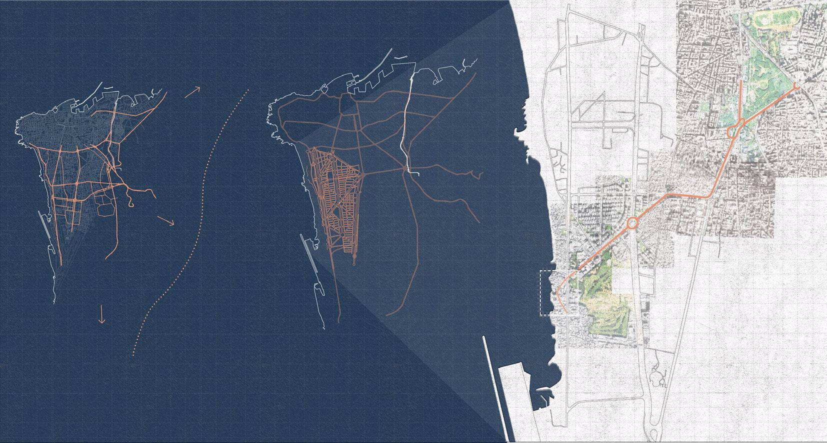 The initial plan was to provide a new place to house the political structures, which happened to be in the sandy dunes of the southern suburbs of Beirut. However at the time of implementation, there was an abundance of informal settlements, which the government was uncooperative in relocating them elsewhere. Since then, the project has been on hold. All that’s left are the remanents of Michel Ecochard’s masterplan. By connecting the remaining the nodes in orange, it has led me to my site; Ouzai.
