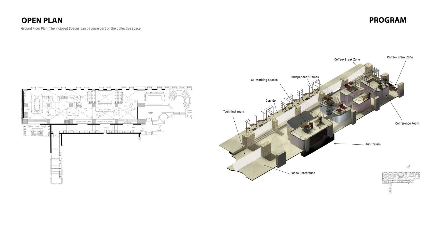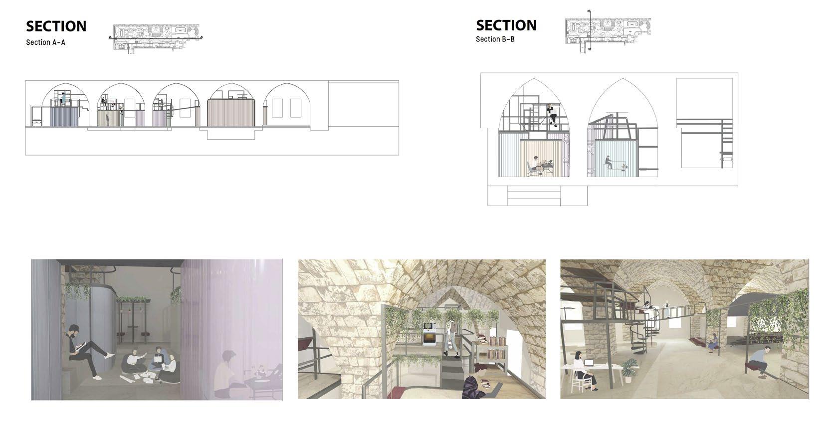 The space is a journey in be-tween times. You are once in the heritage of the ottomans and in a twist of a time you say hello to the future. You enter to place in be-tween spaces that lead you to the galaxy of the future. The hall is transformed into a place where people work, and get stimulated in the twist between the past and the future. The total space is made of a time twister that allows the coming together of the various functions that serve the space. Private func-tions that need an isolation are the travel to the future through tech-nology. The resultant voids are the celebration of collective functions under the historical cross vaults as a connection to the past. The space is conceived as a playful and fluid working environment that supplies the needs of an innovative work-space. The spaces are held through a structural playful frame that holds together the multileveled programs. Thus, the time twister is what clutches the functions to-gether in a similar way to how the key stone holds the arch together.