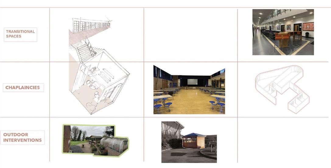 To succinctly organize and analyze my observations, I discovered that creating a matrix diagram was the moststraightforwardapproach. Thismethodgreatly assisted me in identifying common areas shared among the three schools. Among these shared spaces, the chaplaincy stood out as the most iconoc feature in terms of typology and context. Notably, I found that transitional spaces and outdoor interventions were closely linekd to the core principles of integrated education. In the case of Cliftonville, for instance, the corridor served as a space for quiet reflection and worship, while in Lagan College, the social hub just before the chaplaincy acted as a gateway to explore various forms of social interaction, often requiring privacy for open and sensitive discussions on delicatetopics.