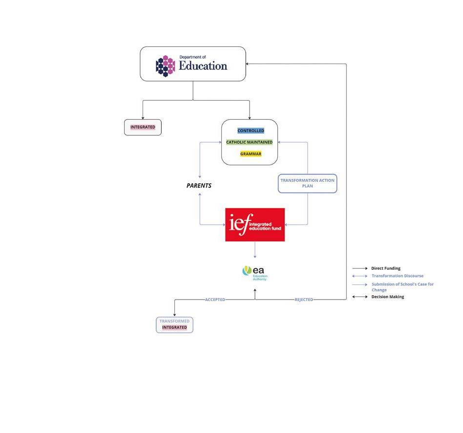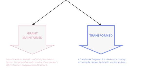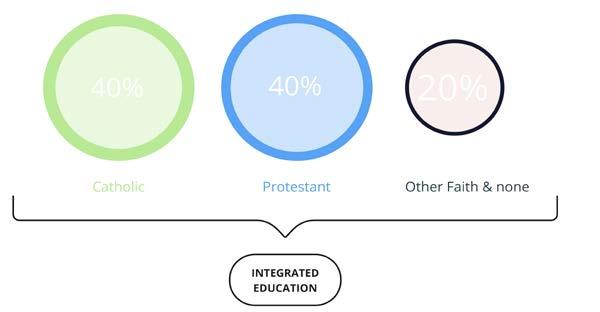 To be�er understand the great demand for integrated educa�on, the above diagram applies the propor�onate formula for inclusivity and togetherness in Northern Ireland. It is an educa�onal sector that brings together students primarily from Catholic and Protestant backgrounds, and welcoming children from other faiths and none under one roof, by accep�ng their cultural differences and empowering communal rela�ons for a be�er shared society. It also cons�tutes two different kinds of integrated educa�on. One that is grant maintained and the other transformed.