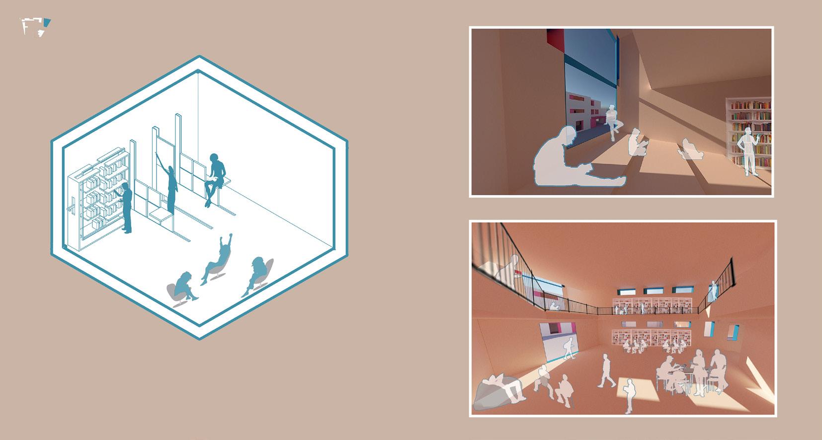 In the blue and introverted literary building, I designed a mechanism for the book shelves, so that it would be more feasible fro the students to pick out a book. But most importantly, how practical the furniture is for them to slide from the wall, be it a chair or a table. When they are tucked away, this will leave more room for multipurpose activities. This spatial configuration is derived from the playing fields children would find at any given opportunity to just have a good time.