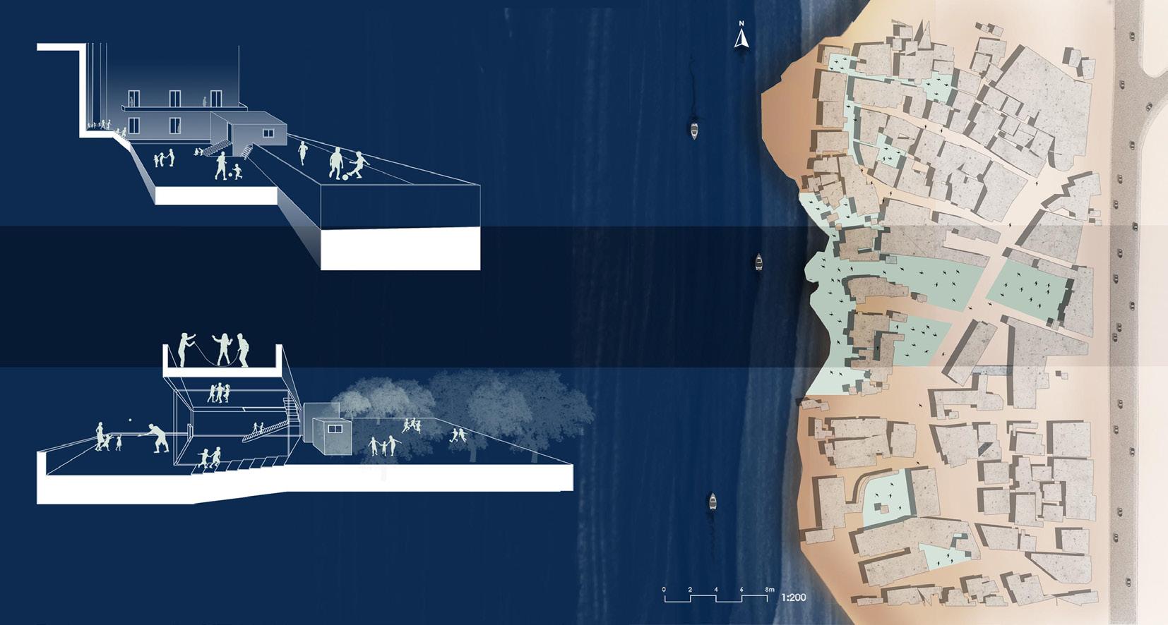 The designated site is packed with irregular roads, but the children who have lived there long enough to know the ins and outs of their neglected area, have managed to explore it everyday in a different lens. The locations of the sea, their school, their friends house have not changed, but the routes they take and the spaces they maneuver in vary greatly to reach them. The above illustrations are examples of them such as; rooftops of some households, in between private courtyards, gated lots, and of course the shore.