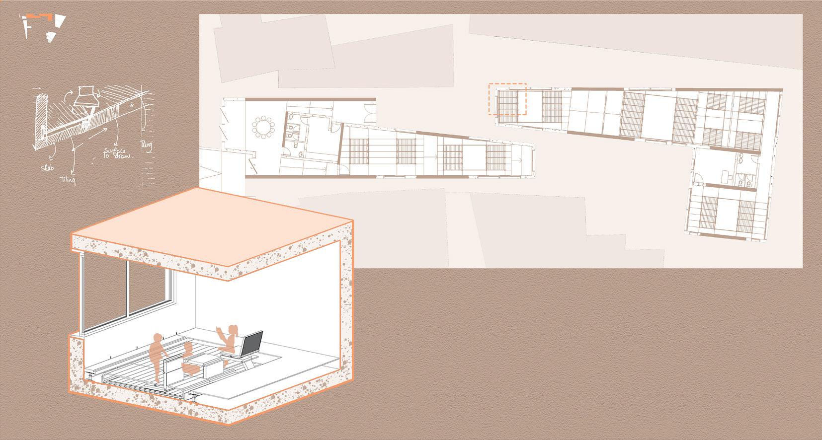 In the detail on the left, I used a raised floor system to embed their mechanical chairs underneath. Where, they can slide them, and then pull them whenever they‘re in session. Furthermore., the chair is versatile in itself; it can be turned into a table, rotated and slid toward the window to read or simply interact with their friends.
