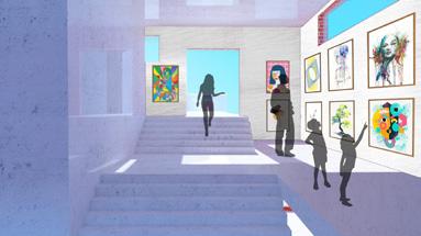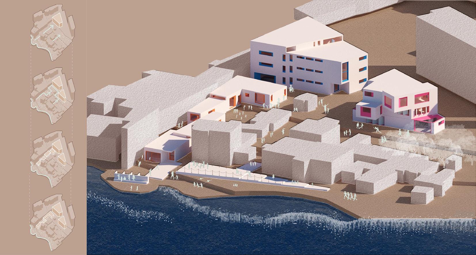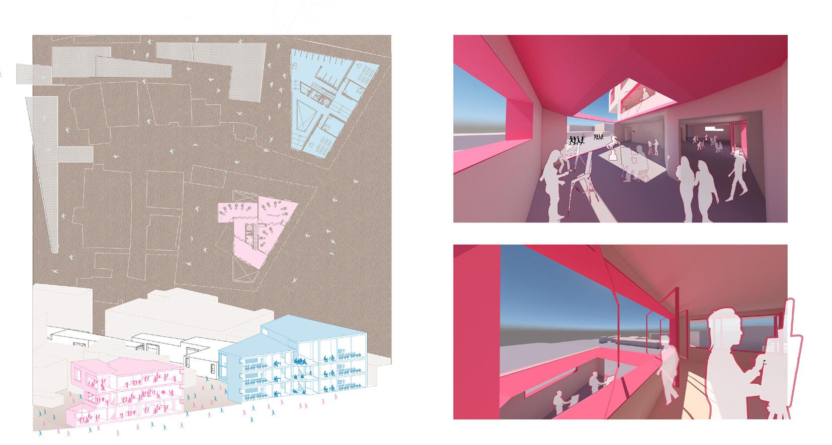 One that has language, literary and science classes with an extensive library. And the other, with art classes and a continuous exhibition on all floors, standing before an open space for children to play. Going down from the literary class building there are two L-shaped kindergarten buildings facing opposite each other, creating narrow paths replicating the existing informal fabric. Furthermore, positioned in a way to allow courtyards fill the space in between for children to explore with a new lens as mentioned earlier. Finally, an expansion of the kindergarten reaches an infrastructure for children to run an exercises fun activities complimenting the overall project.