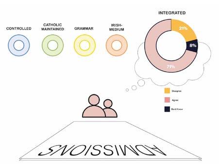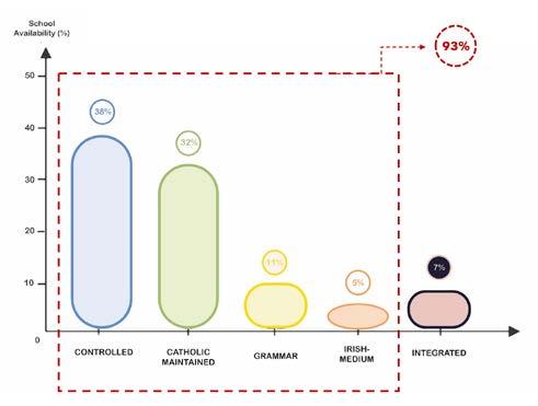 There are five different types of educa�onal administra�ve structures, fice op�ons to choose from. Except that the teo prevailing models, the controlled and maintained schools, have robbed the parents' liberty of choice. As of the parents' requests for integrated schools have only been accommodated by seven percent of integrated schools na�onally, where they are annually met with oversubscrip�on. In turn, this obligates parents to enrol their children in either a catholic or protestant school, inadvertantly feeding into this thriving segregated cycle. This is quintessen�al in depic�ng the difference between having too many op�ons to choose from and thinking that they have a choice.