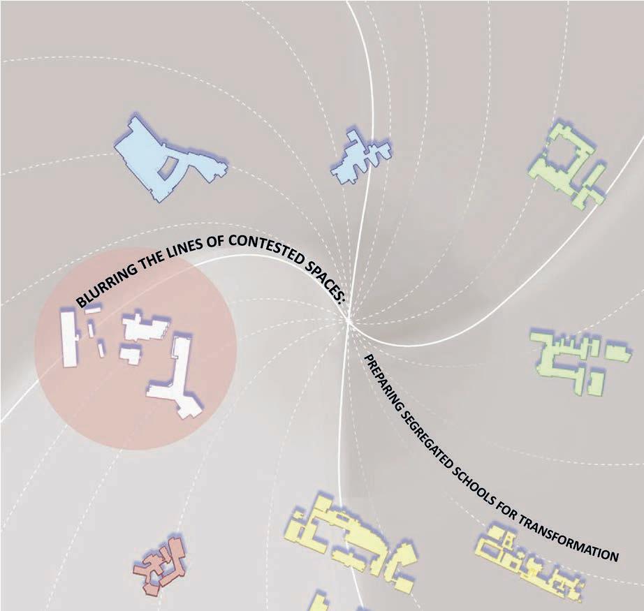In parallel to inves�ga�ng the segregated educa�onal administra�ons and its counter models for co-existence, a trip to Belfast was impera�ve to understand how the integrated schools in par�cular were prac�cing their ethos of acceptance and what occupied spaces that clearly iden�fy with the no�ons of integra�on. From the seven schools I have visited, I found myself le� with the most insigh�u conversa�ons from the three schools denoted on the map, with the respec�ve headmasters in the following order from top to bo�om: Mr. Bill Fletcher, Mrs. Aine Leslie, and Mrs.Amanda McName. They navigated me around their schools, where I had the opportunity to observe and document their unique spaces, which have led me to analyze later and categorize some of the common spaces they share.